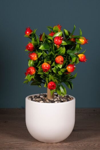 Beyaz Renkli Saksıda Yapay Meyve Ağacı Taş ve Bambu Detaylı