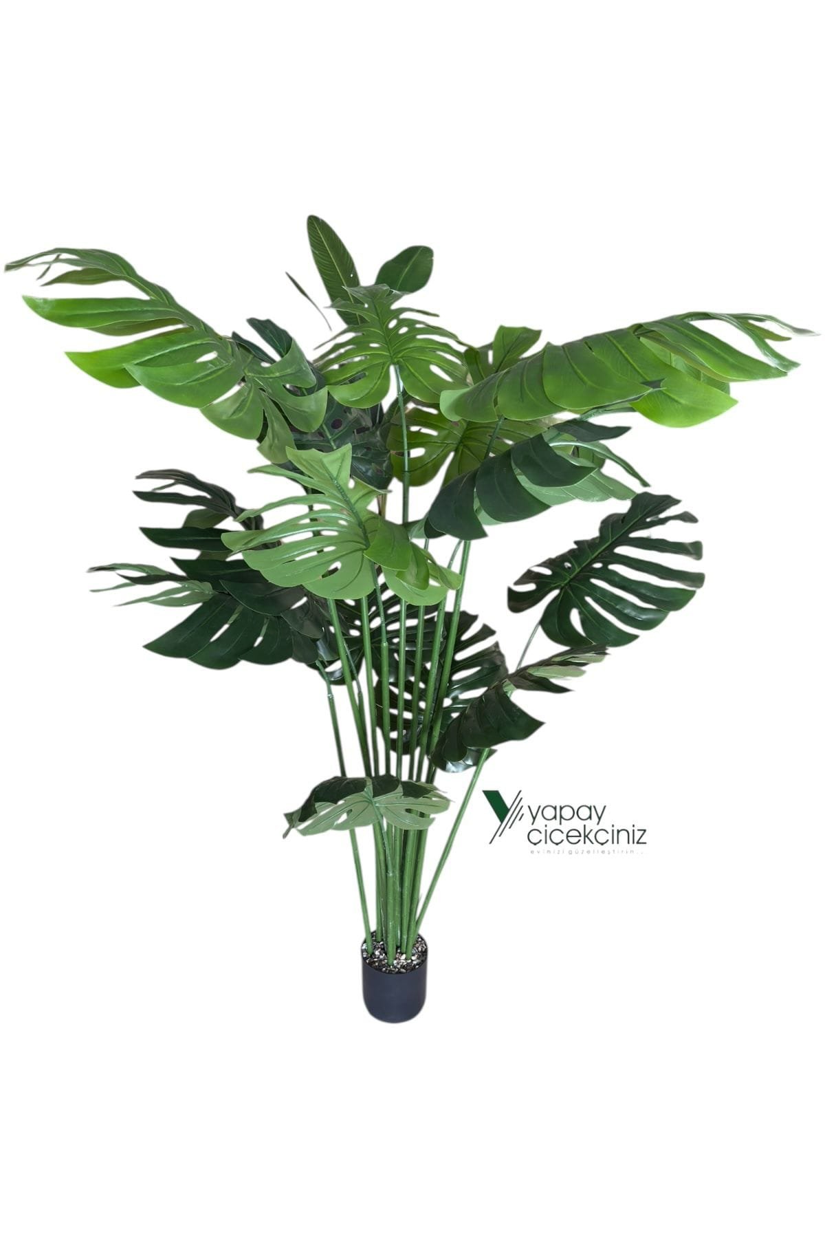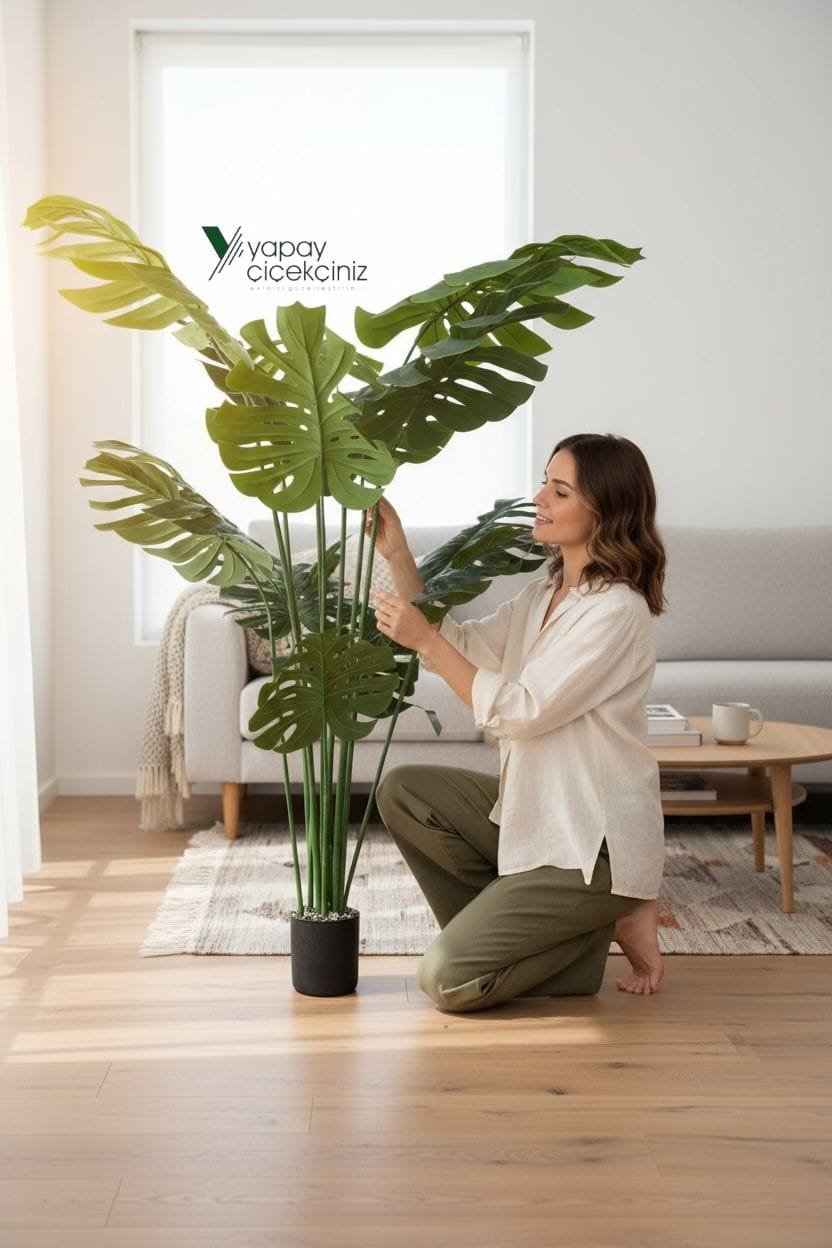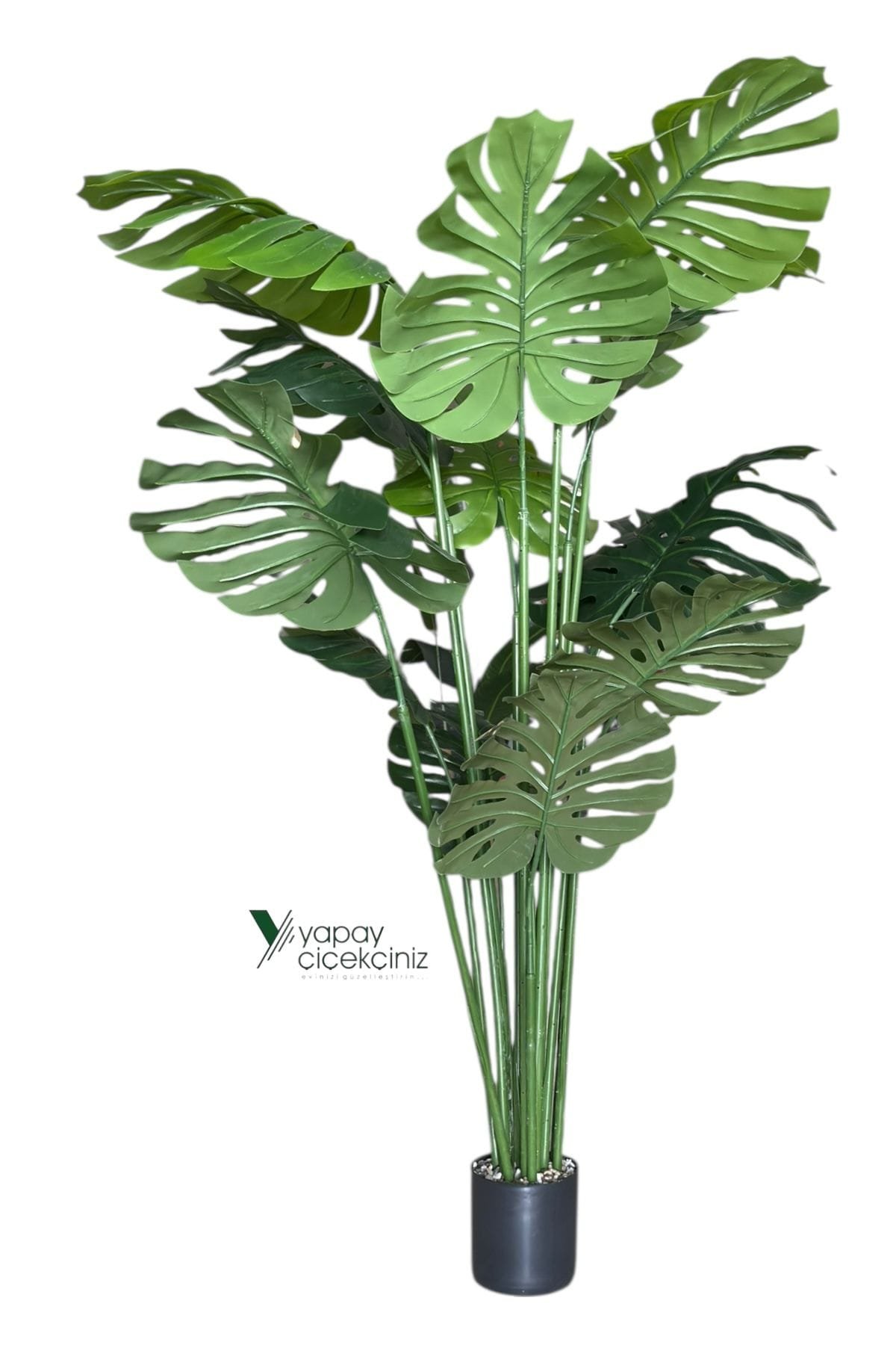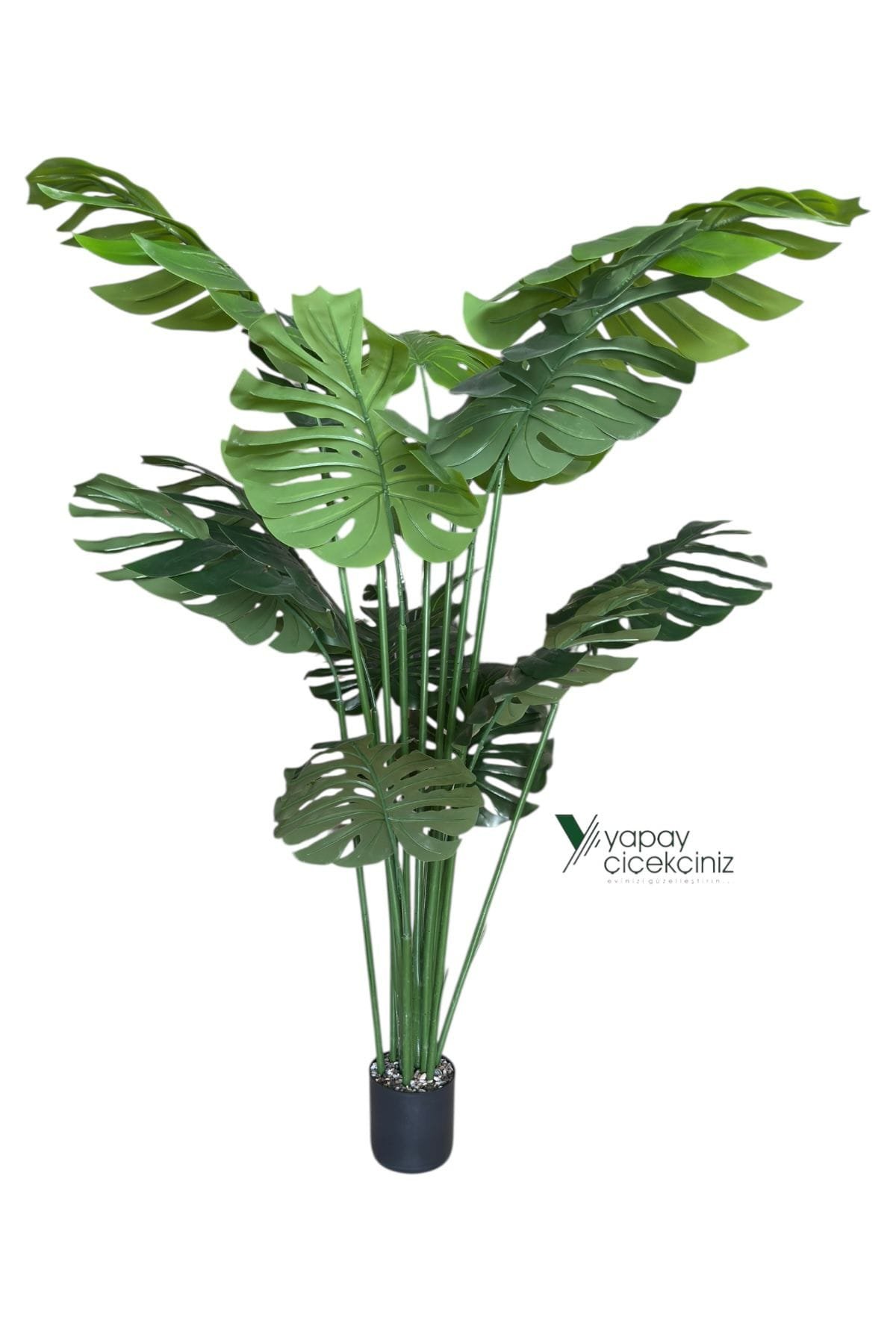 Ev ve ofis dekorasyonuna tropikal bir zarafet kazandıran 150 cm boyundaki Monstera deve tabanı yapay ağaç, 14 dallı yapısı ve 55 cm çapındaki büyük, canlı dokulu yapraklarıyla gerçek bitki görünümüne sahiptir. Siyah renkli modern saksısı ile birlikte gelir ve doğrudan kullanıma hazırdır.