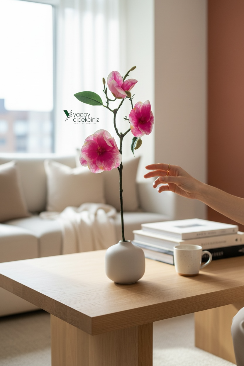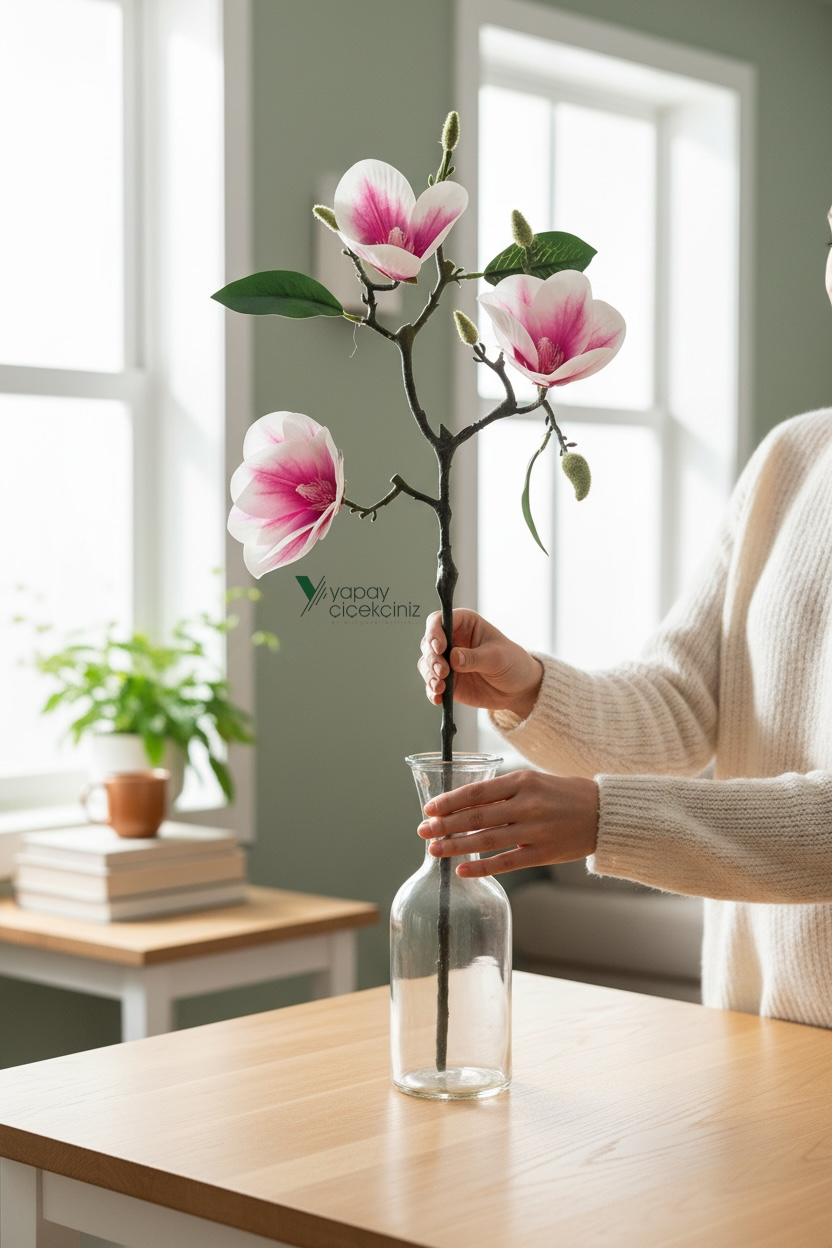55 cm uzunluğundaki bu yapay çiçek manolya dalı, ıslak dokulu çiçekleri ve iri yaprak yapısıyla son derece gerçekçi bir görünüm sunar. Doğal manolya estetiğini yansıtan bu kaliteli yapay çiçek, bulunduğu ortama şıklık ve zarafet katar. Gerçekçi detaylara sahip olan bu yapay çiçek modeli, uzun ömürlü yapısıyla canlı çiçeklere pratik bir alternatif sunar.