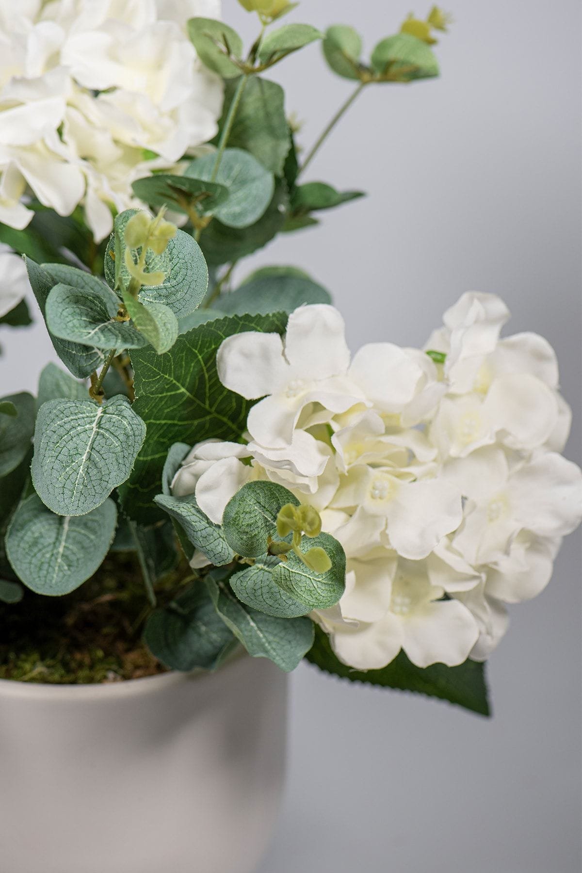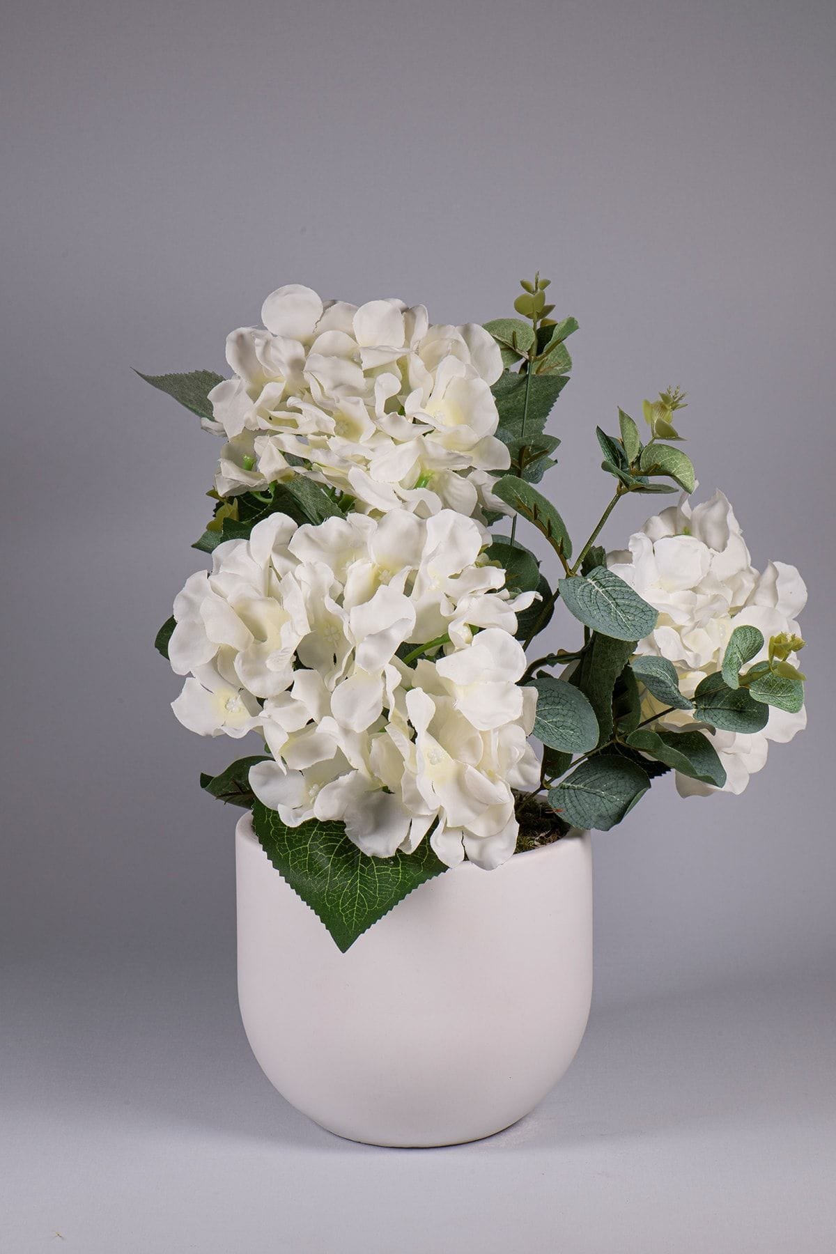 Beyaz Beton Saksıda Ortanca Okaliptus Çiçeği