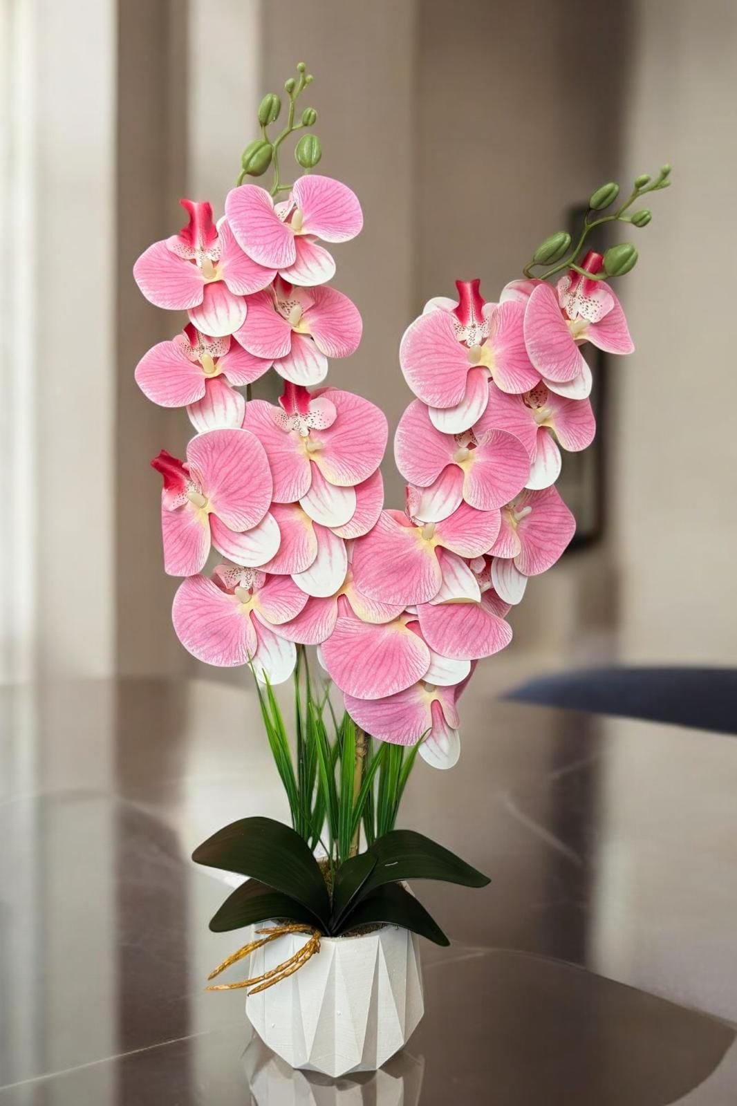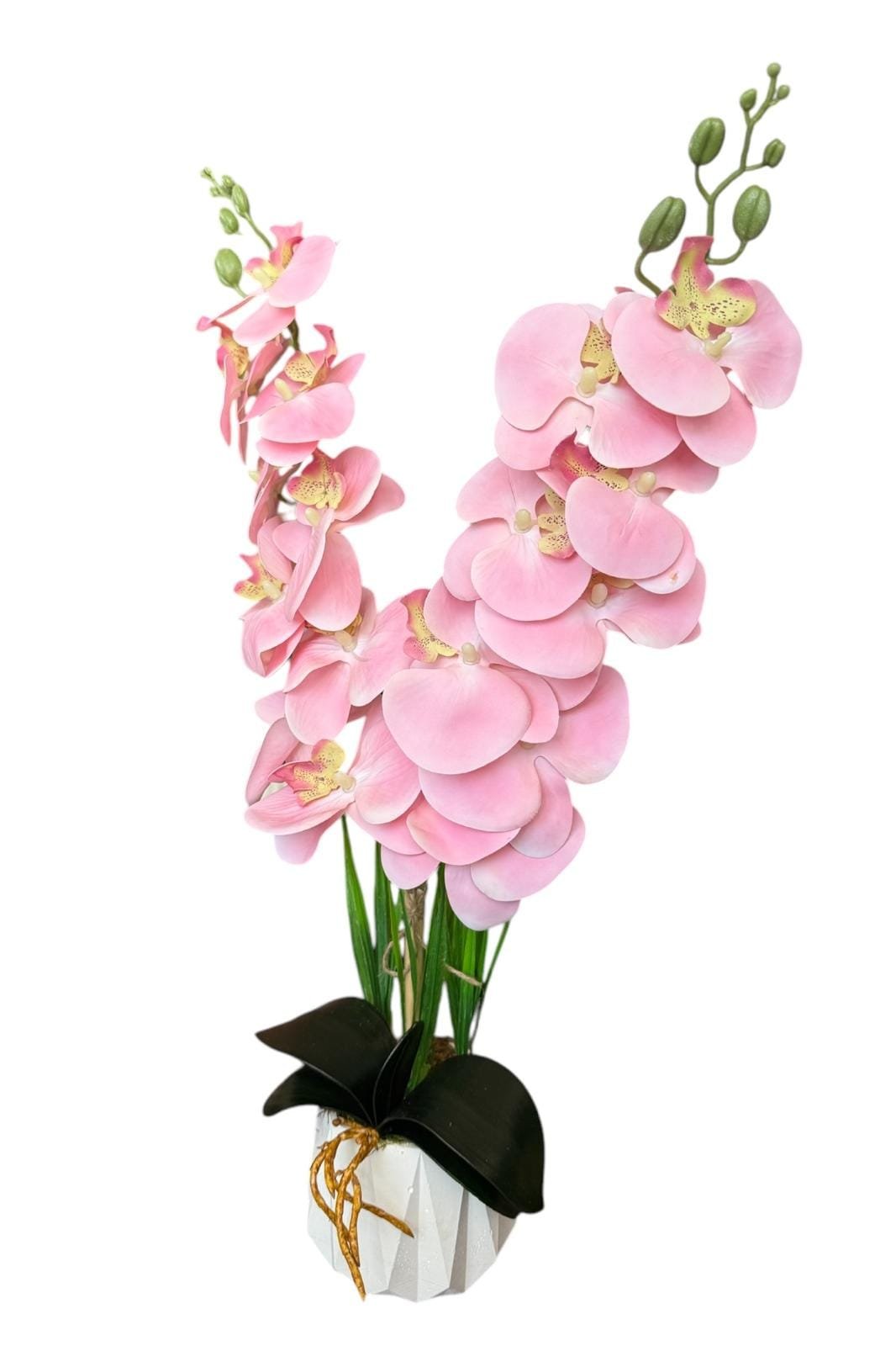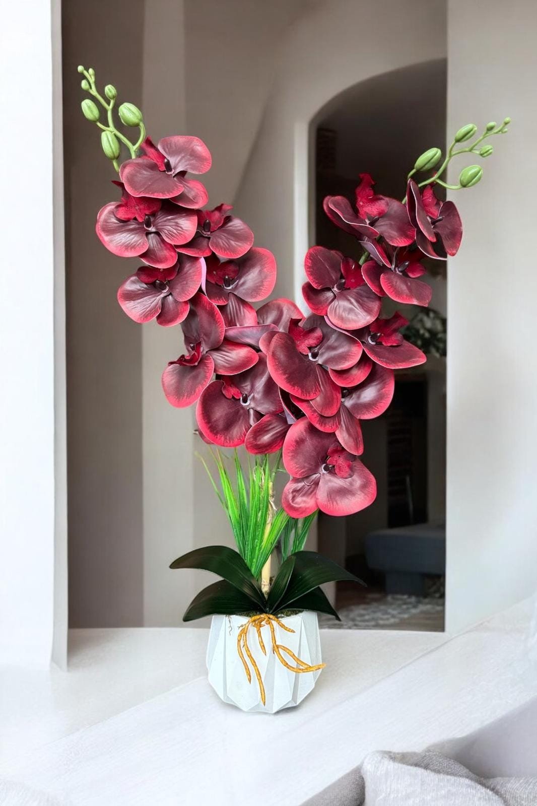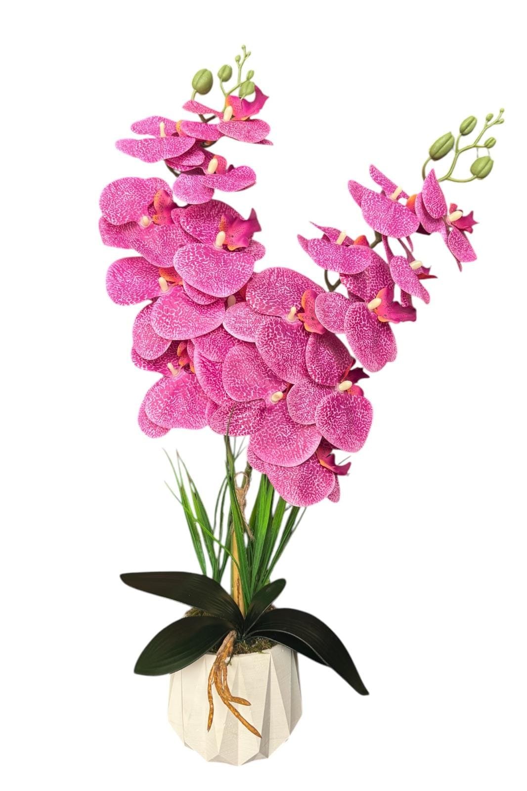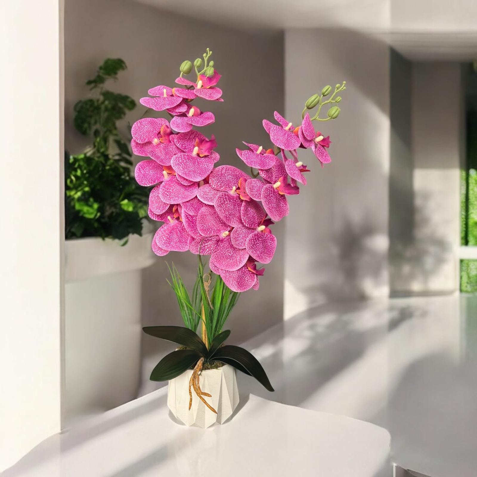 Evinizin veya ofisinizin atmosferine sofistike bir dokunuş katmak için tasarlanan bu yapay orkide ağacı, doğal güzelliği ve zarafetiyle göz kamaştırıyor. 60 cm boyutu ve beyaz beton saksısıyla her mekana kolayca uyum sağlayan bu özel tasarım, iki adet yüksek kaliteli, ıslak görünümlü orkide dalıyla gerçeğinden ayırt edilmesi zor bir estetik sunuyor.