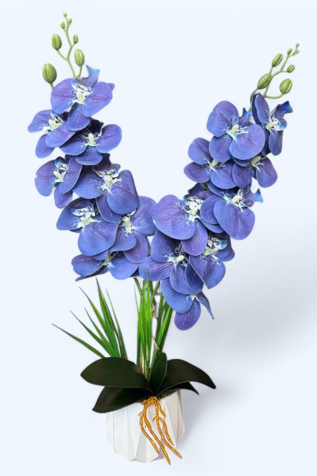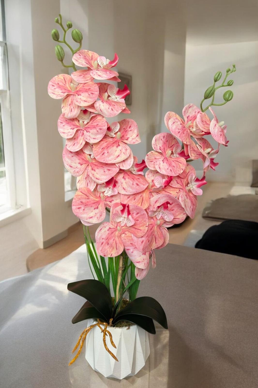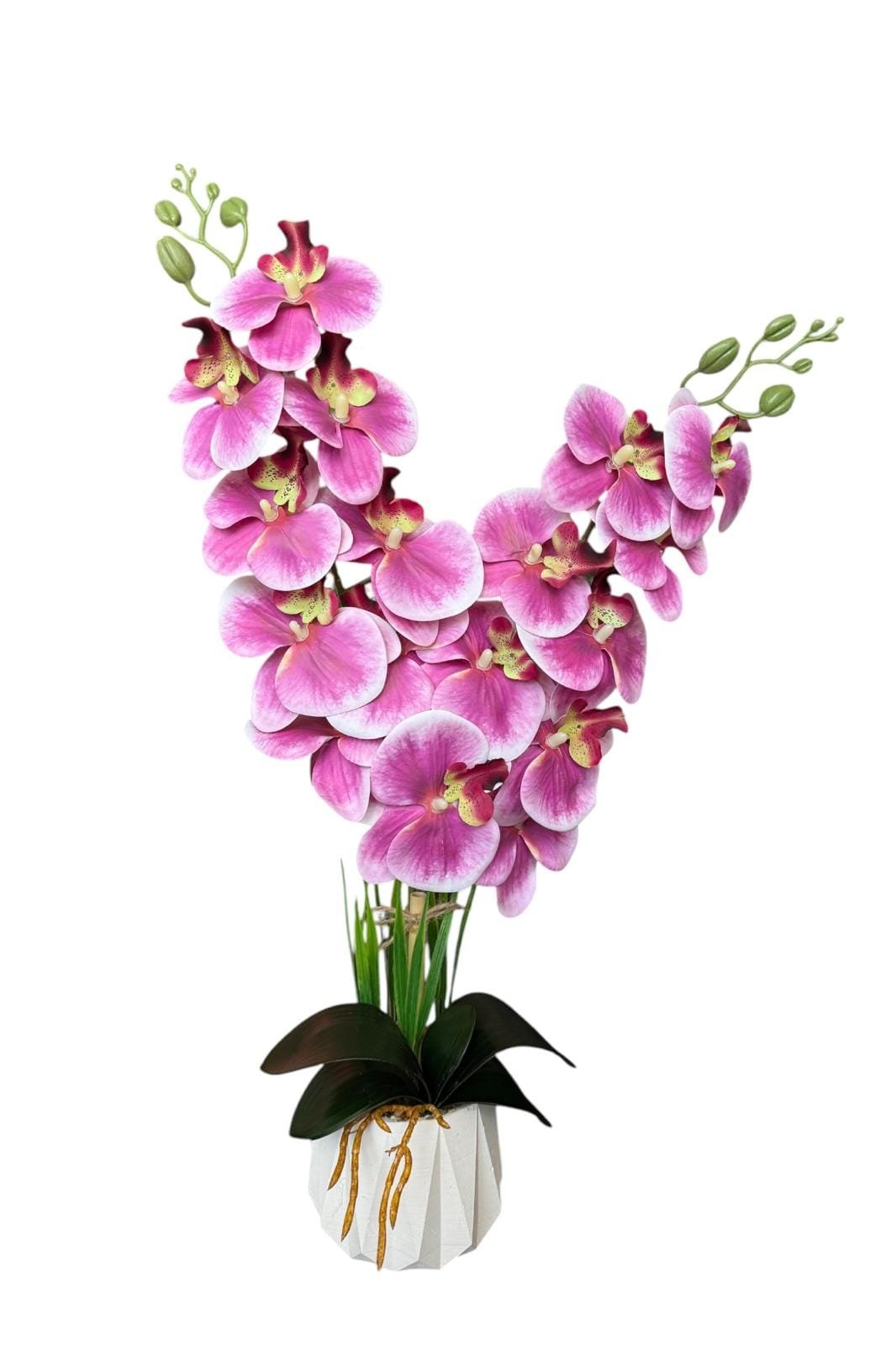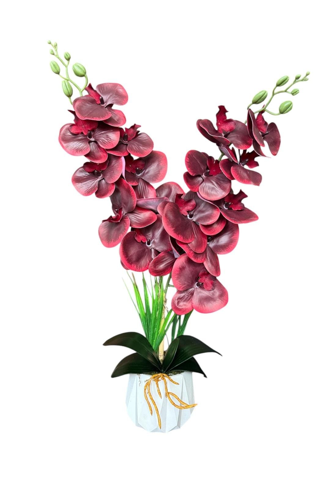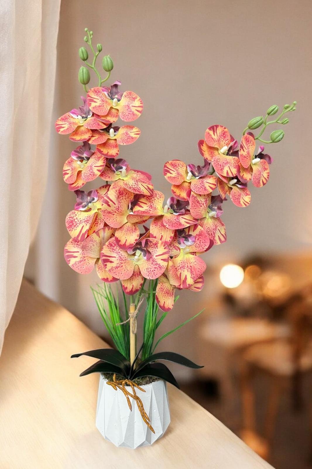 Evinizin veya ofisinizin atmosferine sofistike bir dokunuş katmak için tasarlanan bu yapay orkide ağacı, doğal güzelliği ve zarafetiyle göz kamaştırıyor. 60 cm boyutu ve beyaz beton saksısıyla her mekana kolayca uyum sağlayan bu özel tasarım, iki adet yüksek kaliteli, ıslak görünümlü orkide dalıyla gerçeğinden ayırt edilmesi zor bir estetik sunuyor.