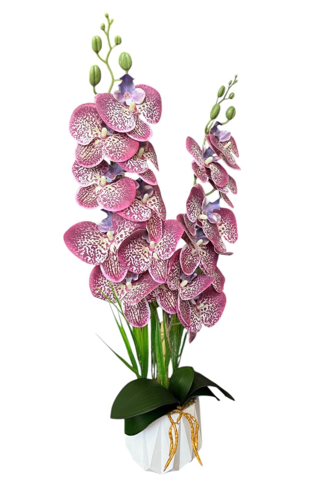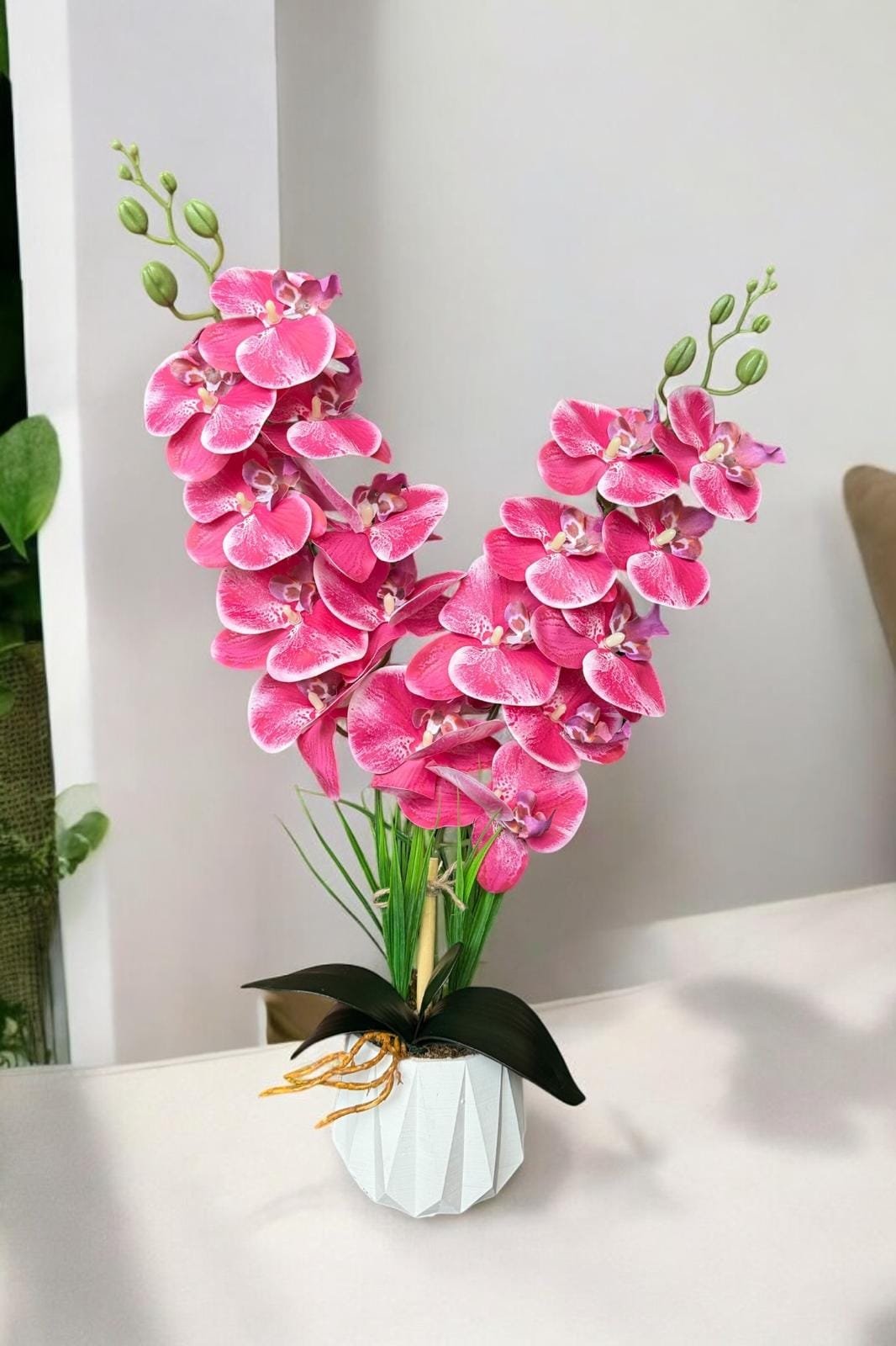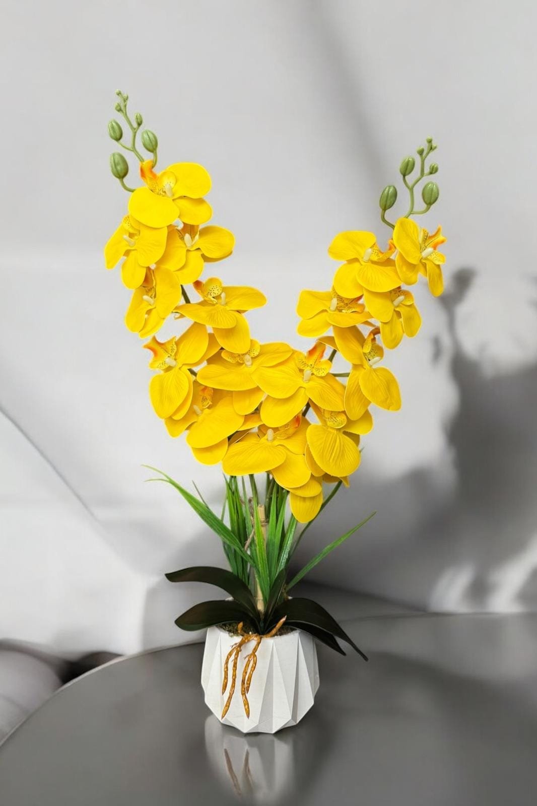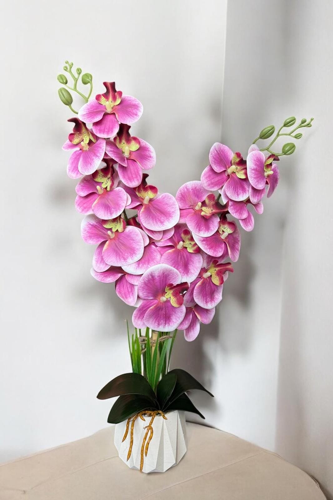Evinizin veya ofisinizin atmosferine sofistike bir dokunuş katmak için tasarlanan bu yapay orkide ağacı, doğal güzelliği ve zarafetiyle göz kamaştırıyor. 60 cm boyutu ve beyaz beton saksısıyla her mekana kolayca uyum sağlayan bu özel tasarım, iki adet yüksek kaliteli, ıslak görünümlü orkide dalıyla gerçeğinden ayırt edilmesi zor bir estetik sunuyor.