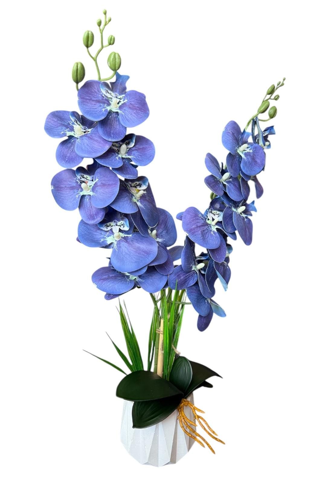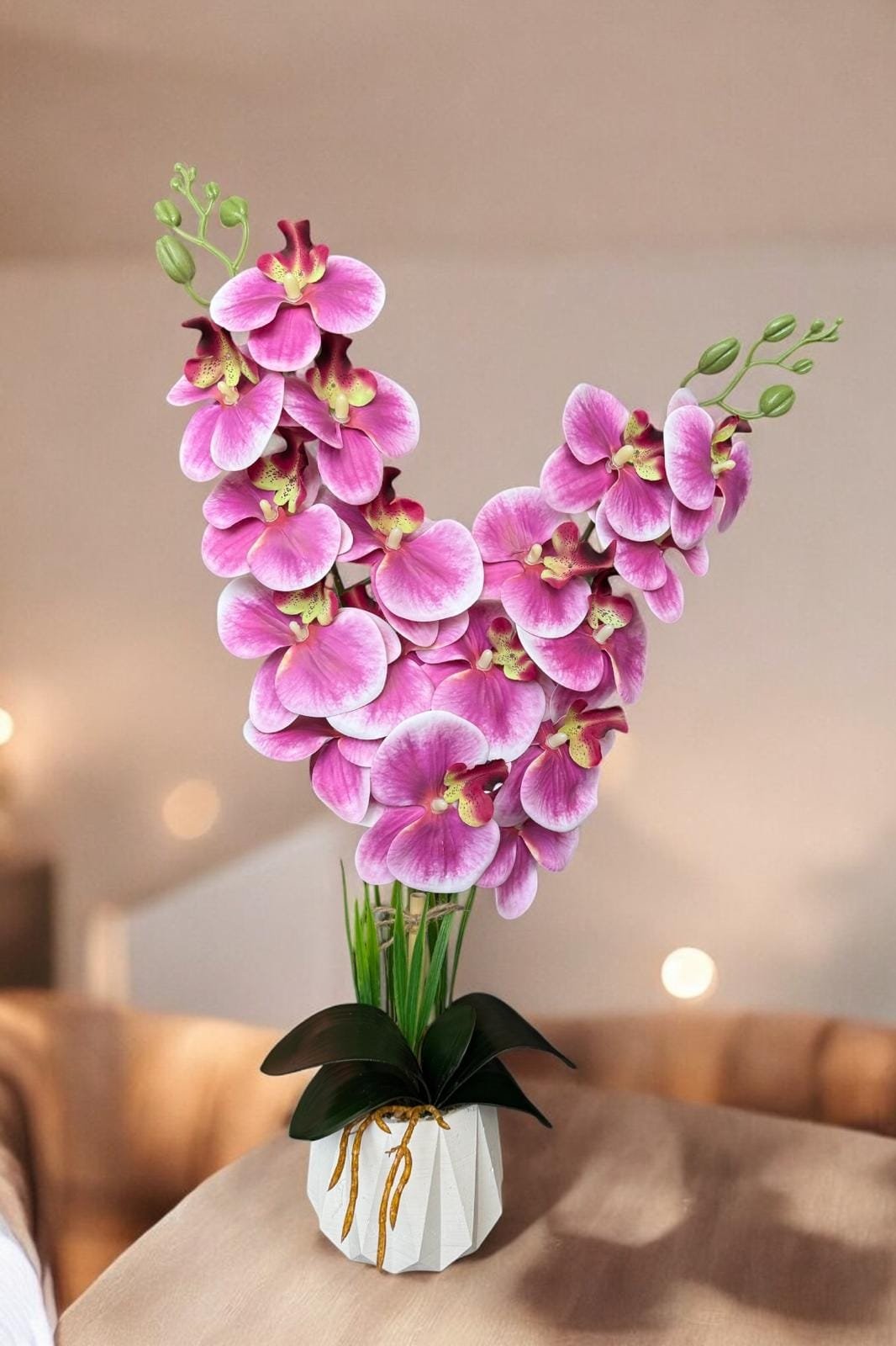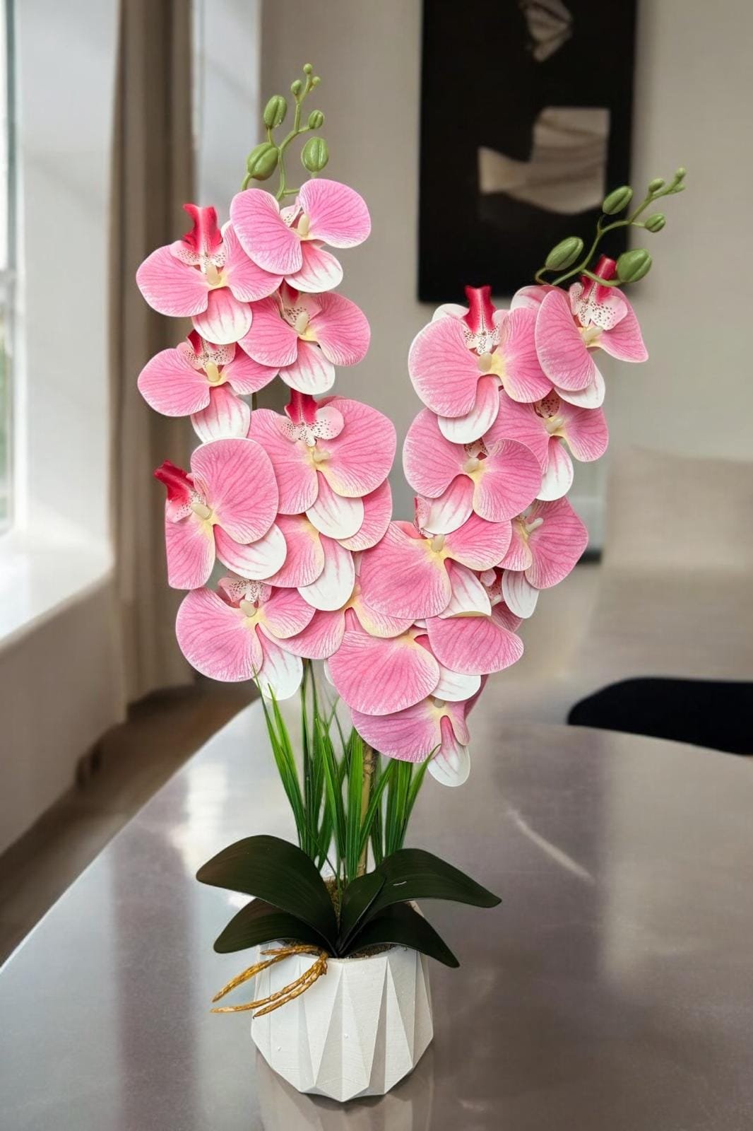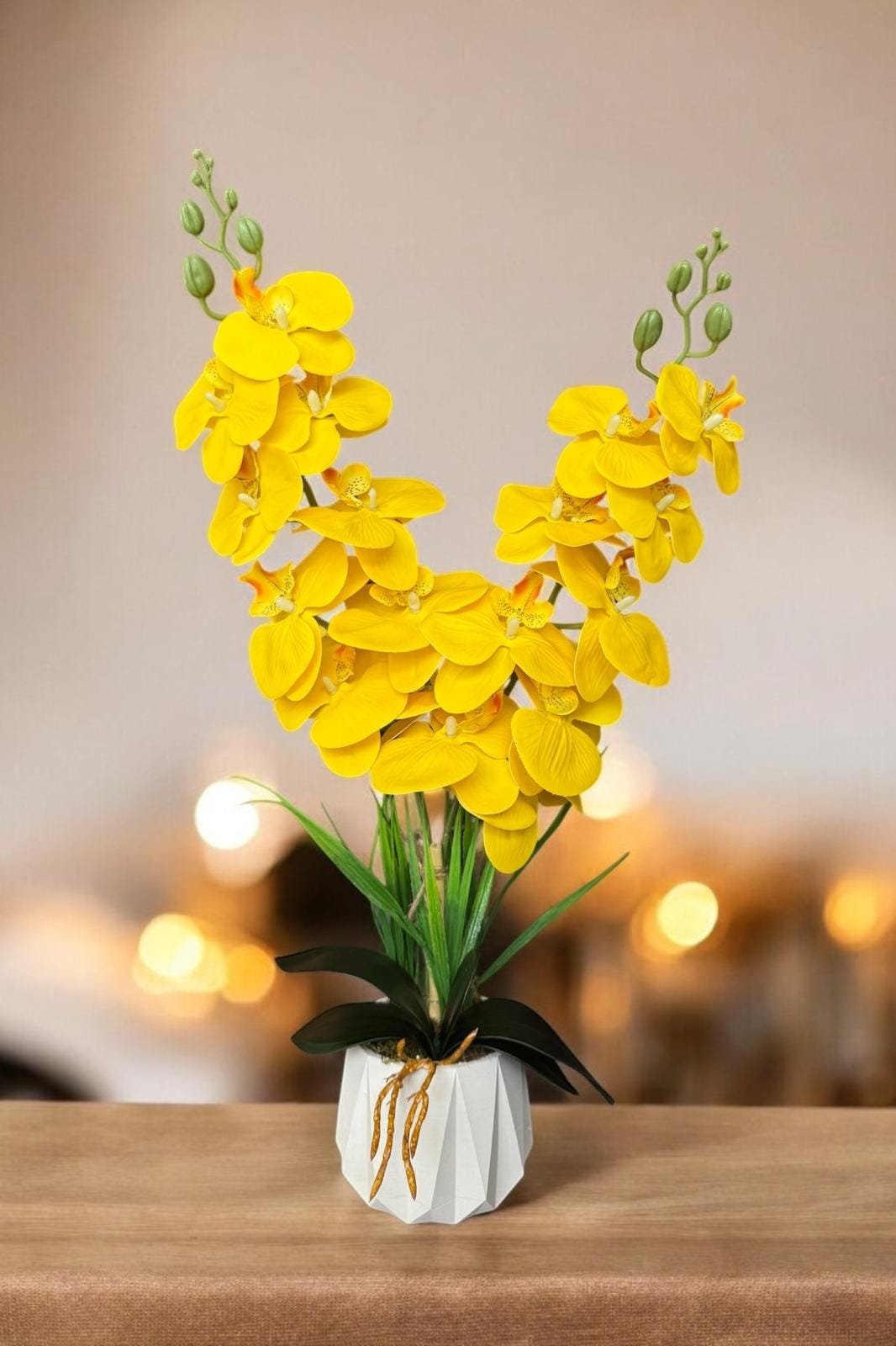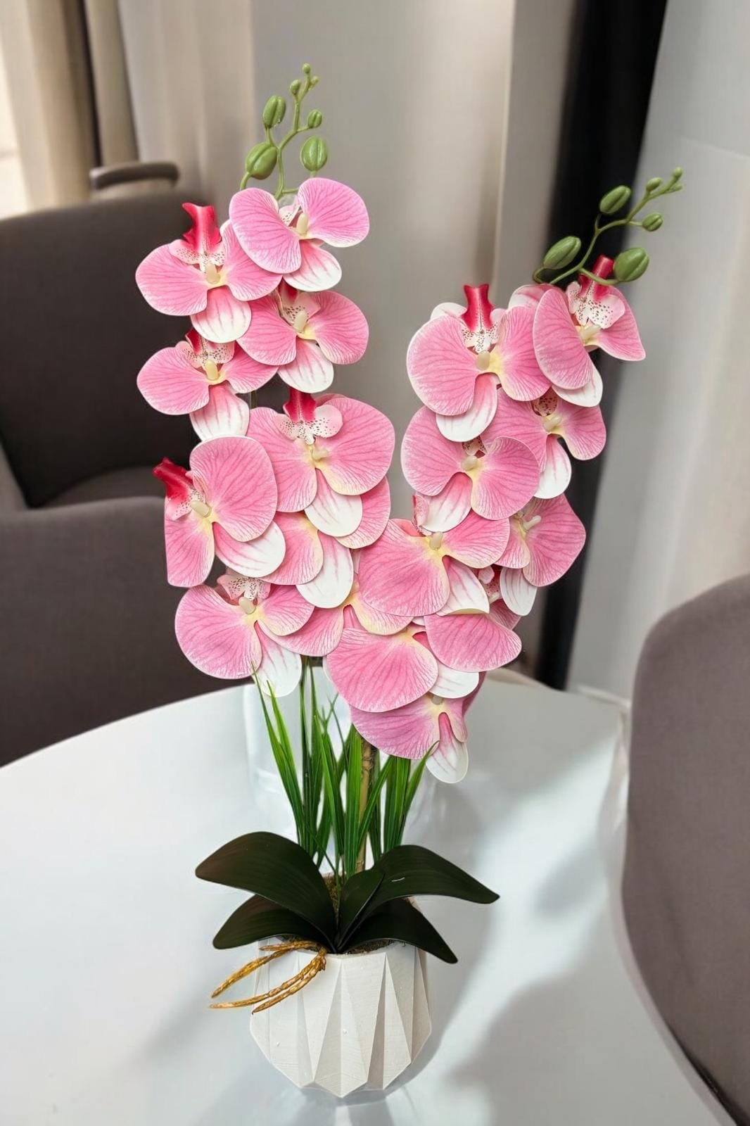 Evinizin veya ofisinizin atmosferine sofistike bir dokunuş katmak için tasarlanan bu yapay orkide ağacı, doğal güzelliği ve zarafetiyle göz kamaştırıyor. 60 cm boyutu ve beyaz beton saksısıyla her mekana kolayca uyum sağlayan bu özel tasarım, iki adet yüksek kaliteli, ıslak görünümlü orkide dalıyla gerçeğinden ayırt edilmesi zor bir estetik sunuyor.