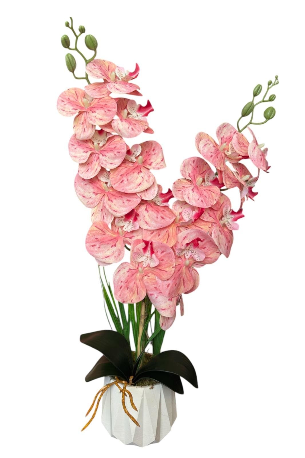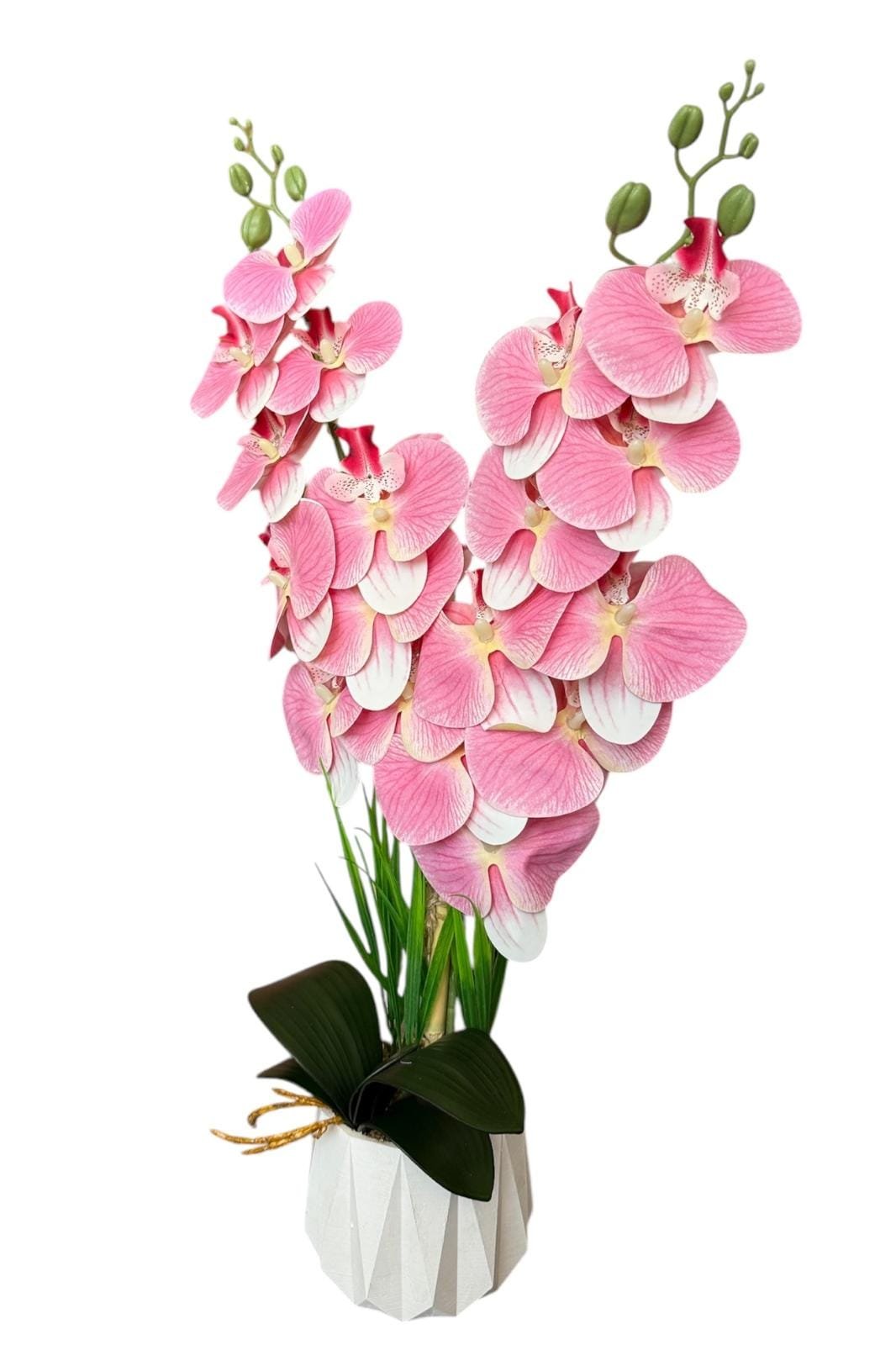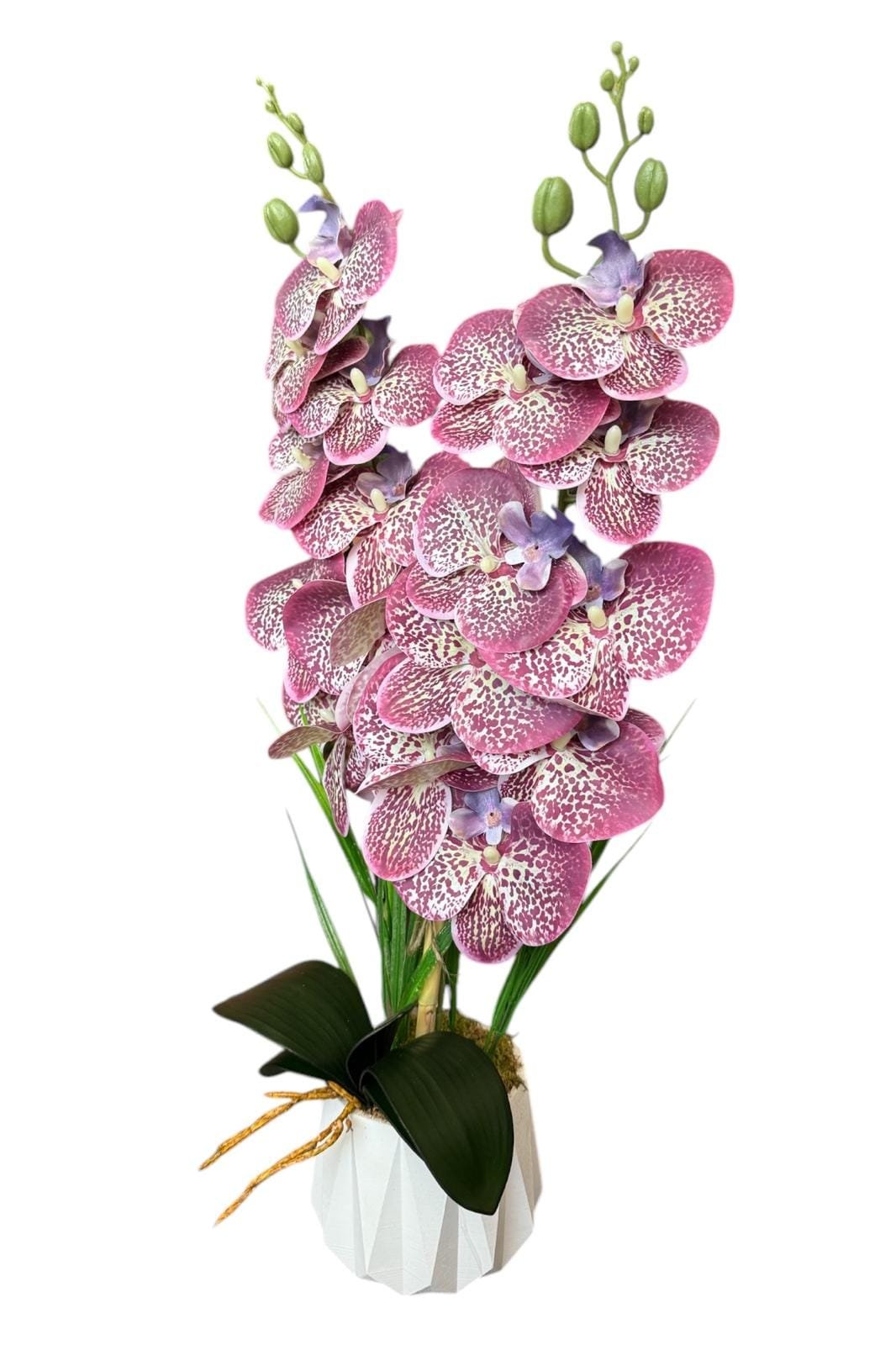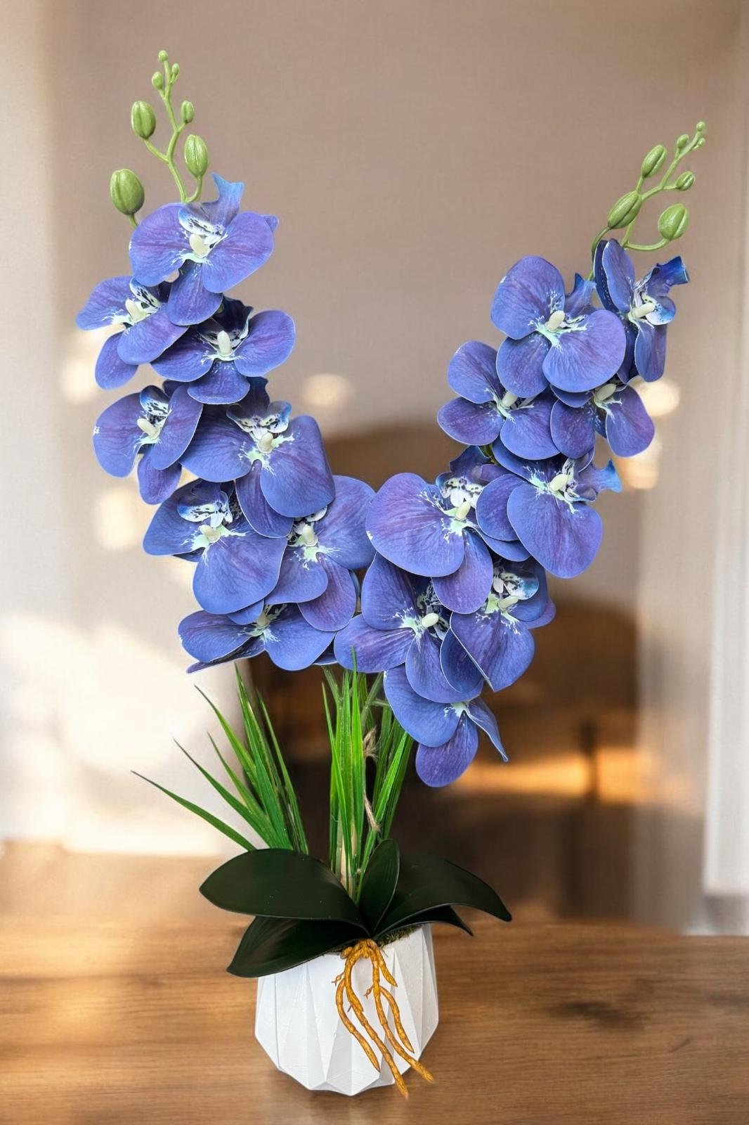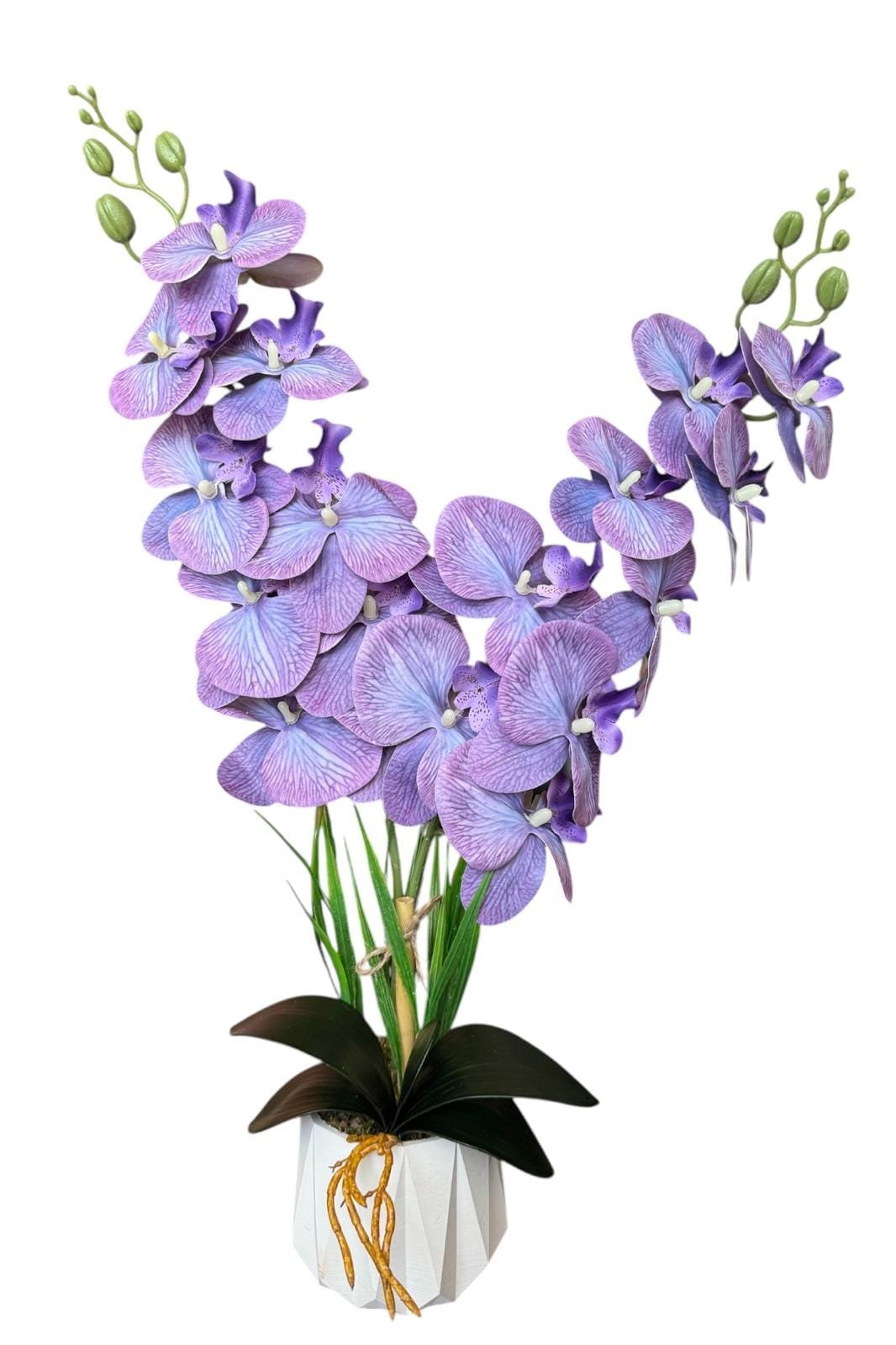 Evinizin veya ofisinizin atmosferine sofistike bir dokunuş katmak için tasarlanan bu yapay orkide ağacı, doğal güzelliği ve zarafetiyle göz kamaştırıyor. 60 cm boyutu ve beyaz beton saksısıyla her mekana kolayca uyum sağlayan bu özel tasarım, iki adet yüksek kaliteli, ıslak görünümlü orkide dalıyla gerçeğinden ayırt edilmesi zor bir estetik sunuyor.