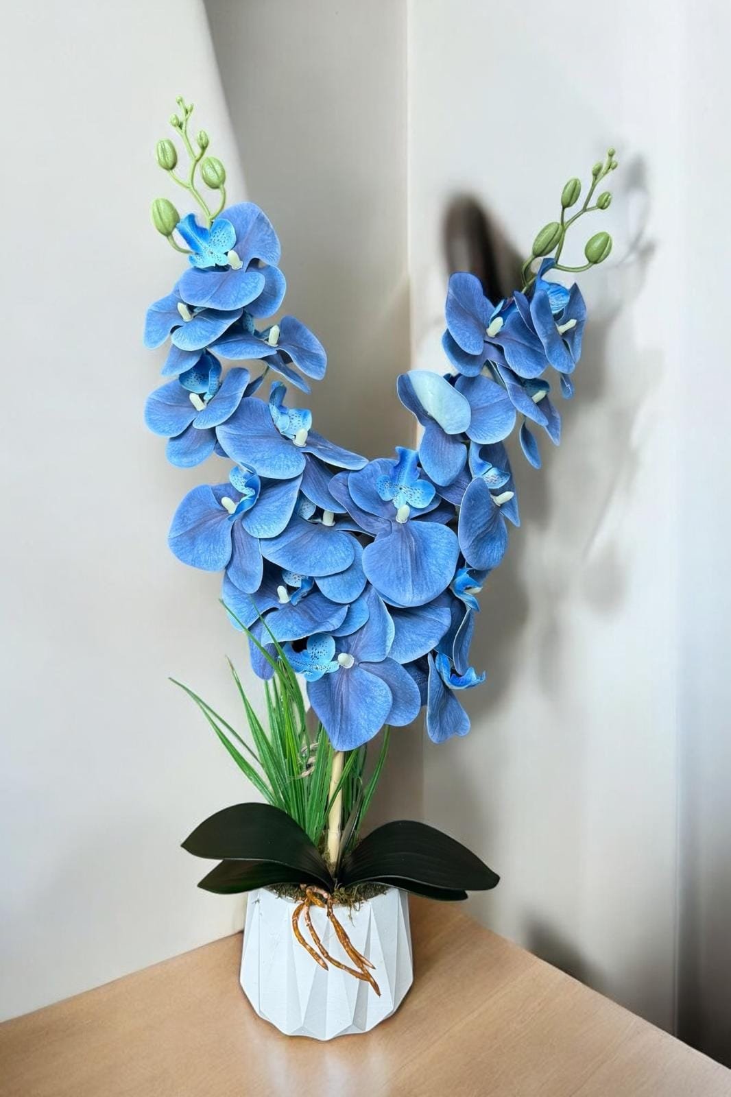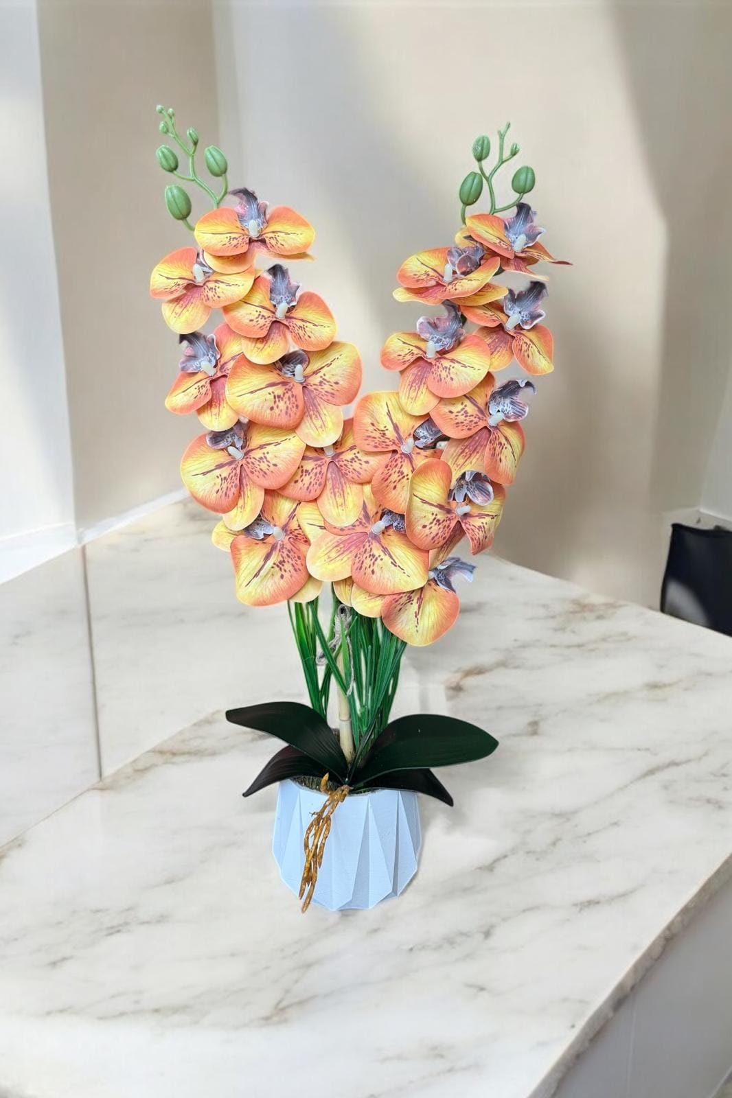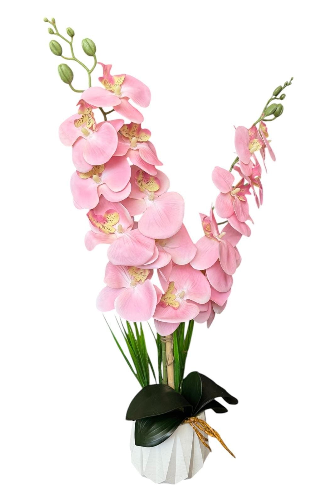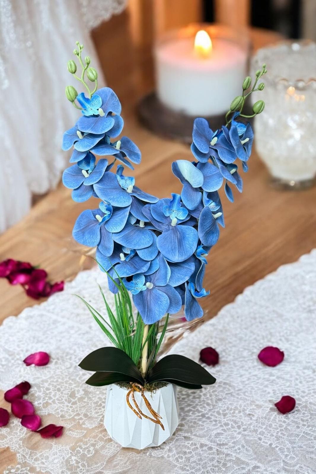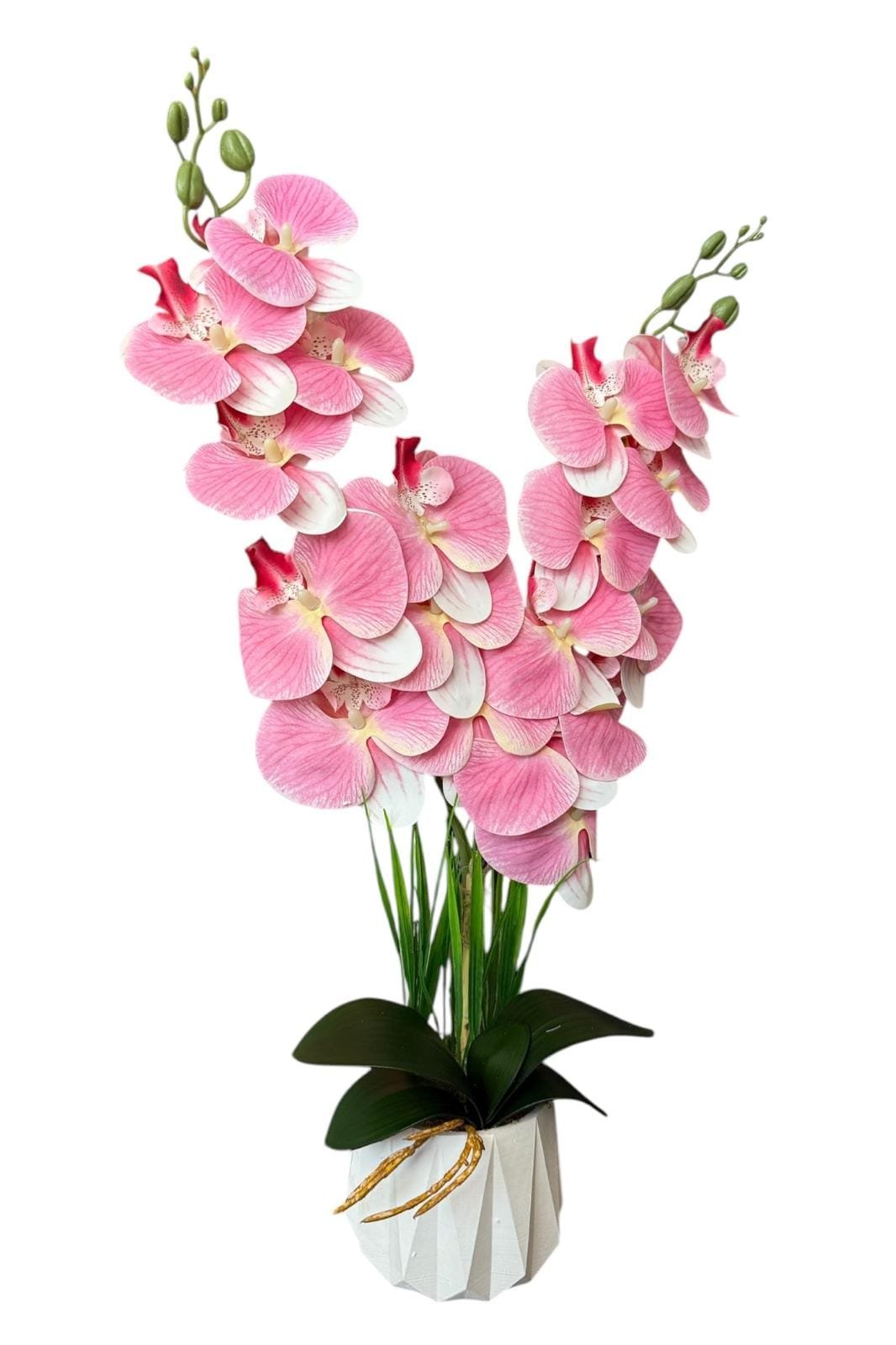 Evinizin veya ofisinizin atmosferine sofistike bir dokunuş katmak için tasarlanan bu yapay orkide ağacı, doğal güzelliği ve zarafetiyle göz kamaştırıyor. 60 cm boyutu ve beyaz beton saksısıyla her mekana kolayca uyum sağlayan bu özel tasarım, iki adet yüksek kaliteli, ıslak görünümlü orkide dalıyla gerçeğinden ayırt edilmesi zor bir estetik sunuyor.