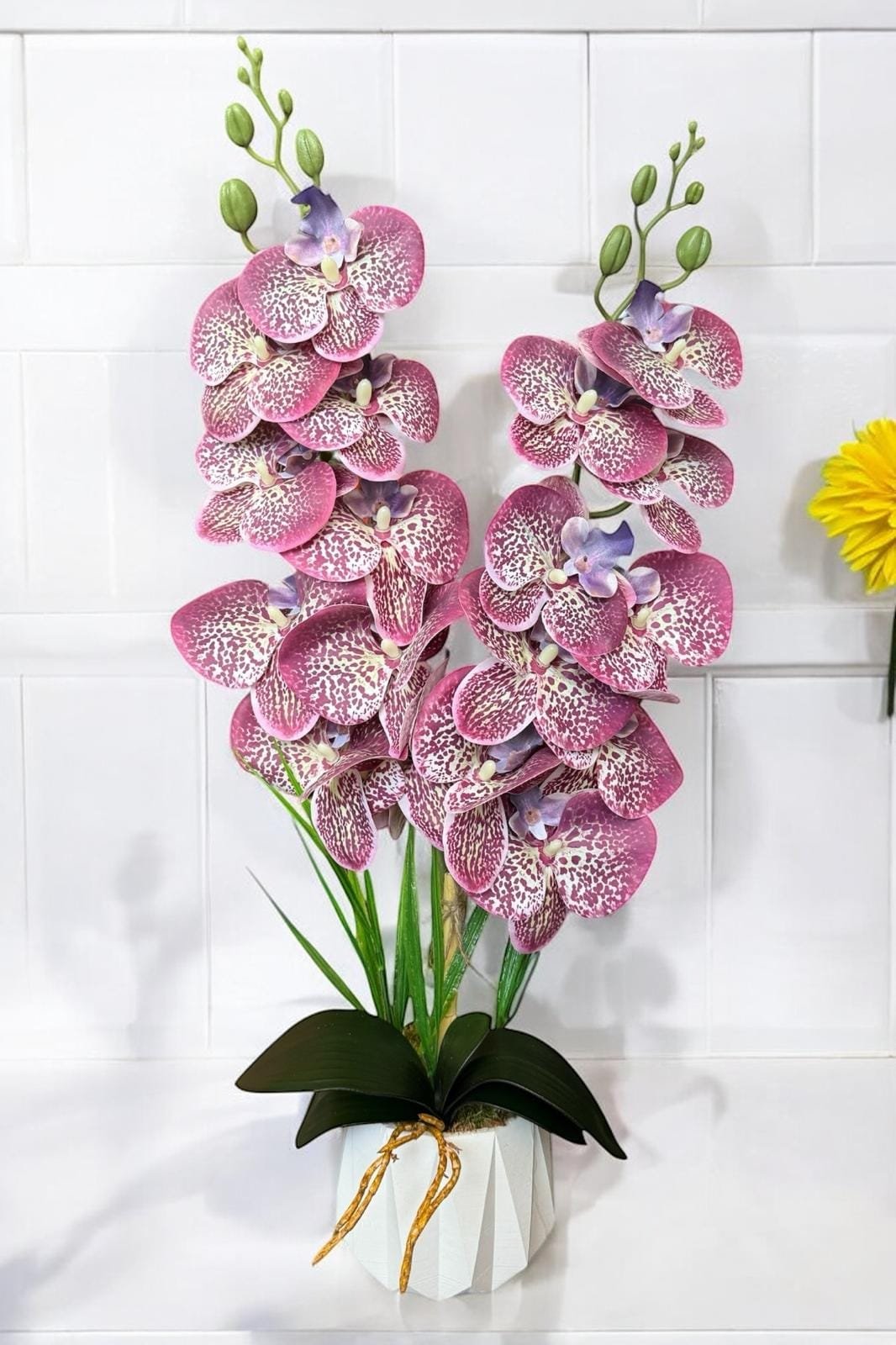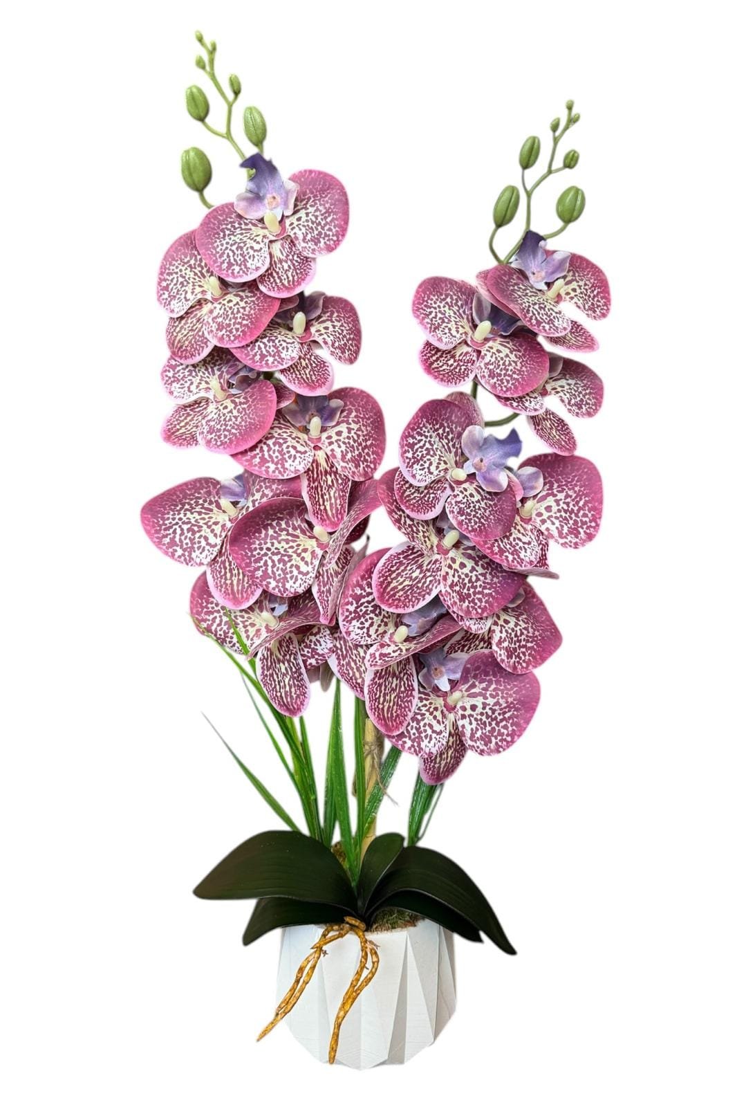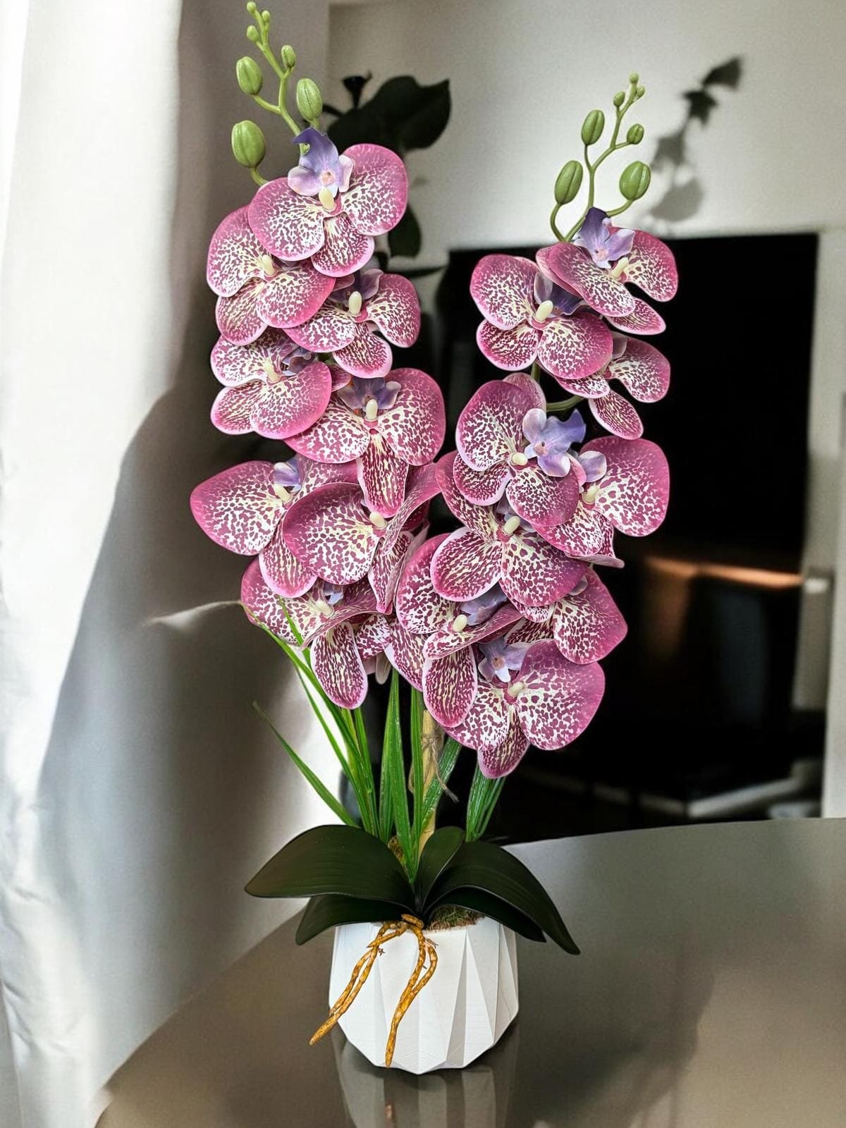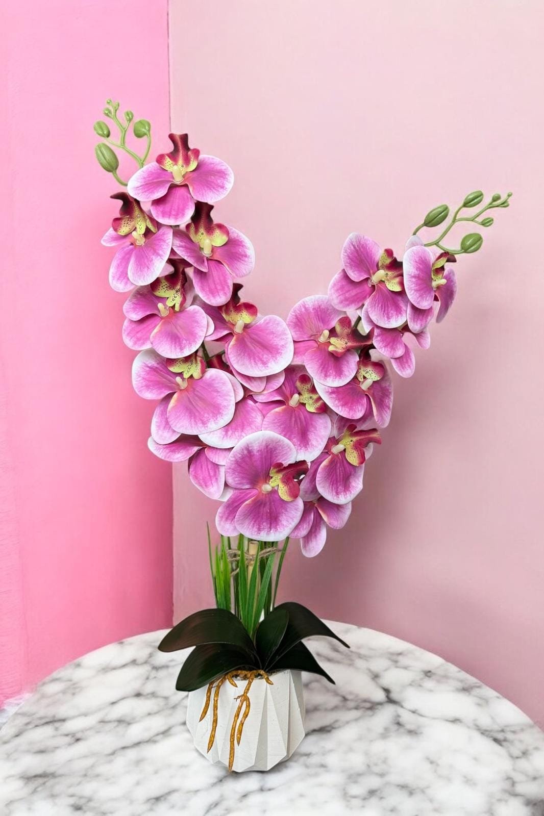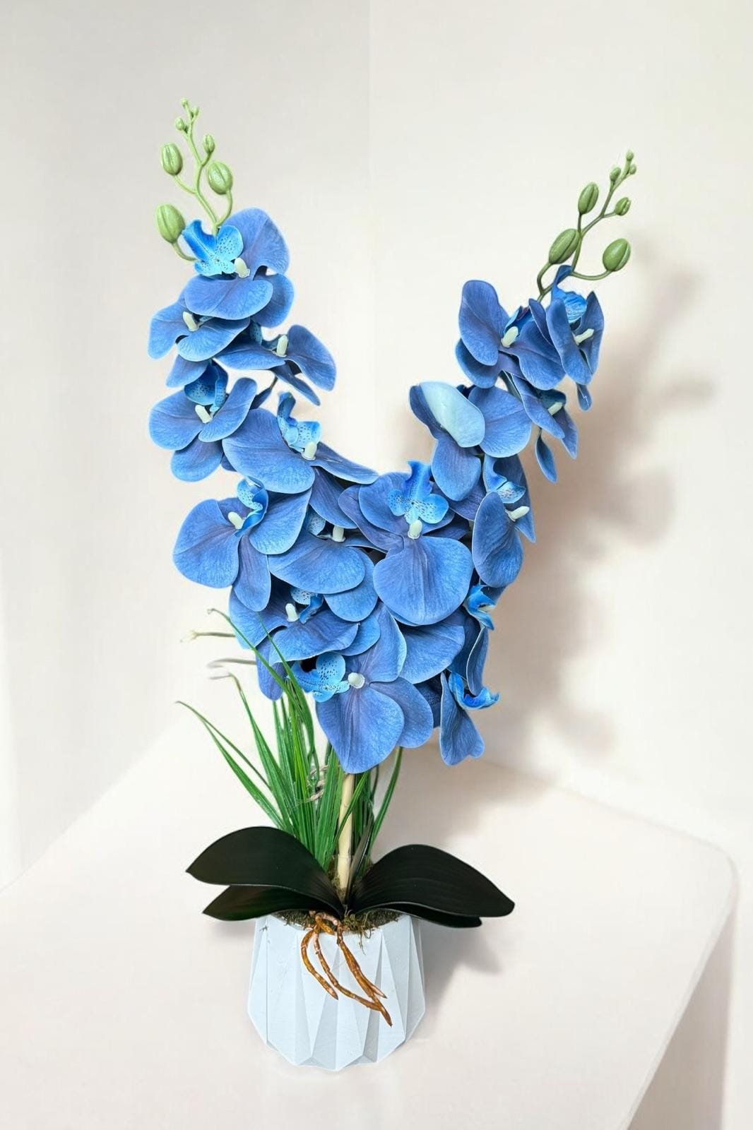 Evinizin veya ofisinizin atmosferine sofistike bir dokunuş katmak için tasarlanan bu yapay orkide ağacı, doğal güzelliği ve zarafetiyle göz kamaştırıyor. 60 cm boyutu ve beyaz beton saksısıyla her mekana kolayca uyum sağlayan bu özel tasarım, iki adet yüksek kaliteli, ıslak görünümlü orkide dalıyla gerçeğinden ayırt edilmesi zor bir estetik sunuyor.