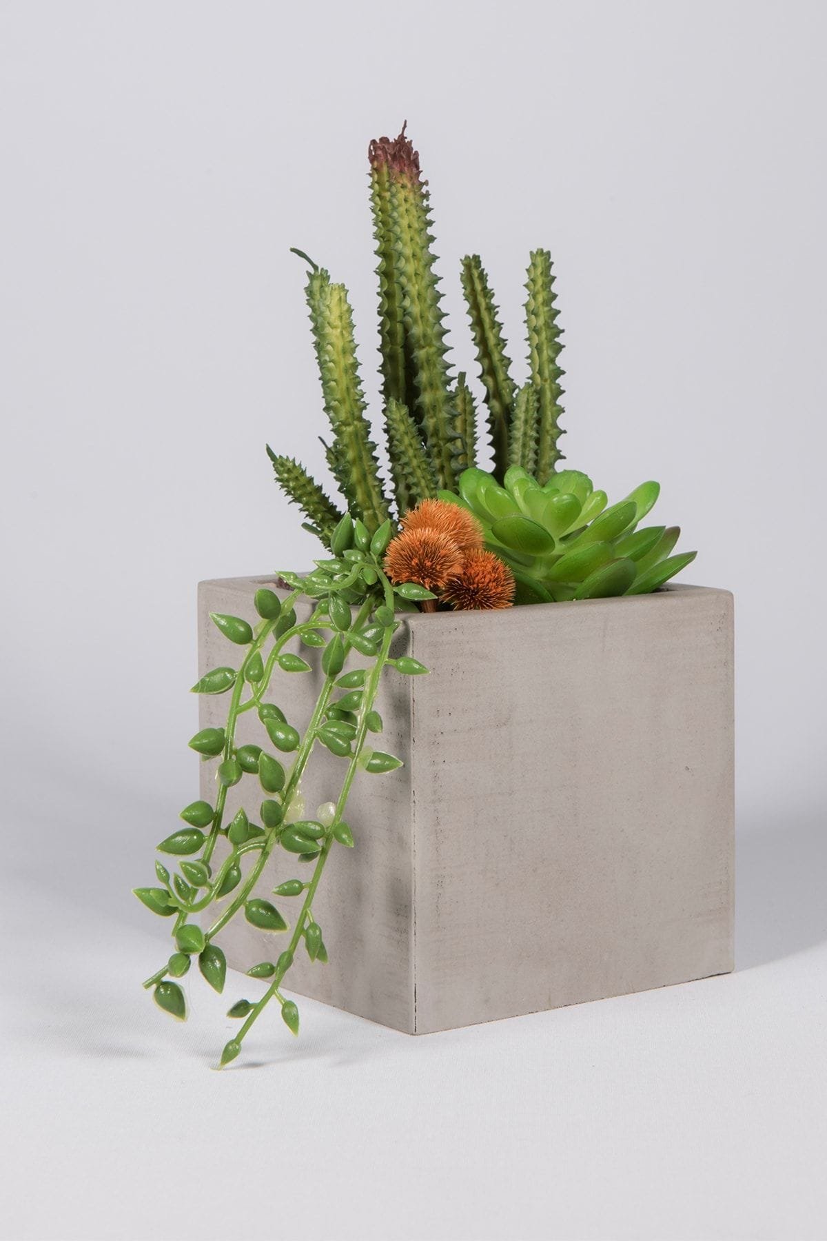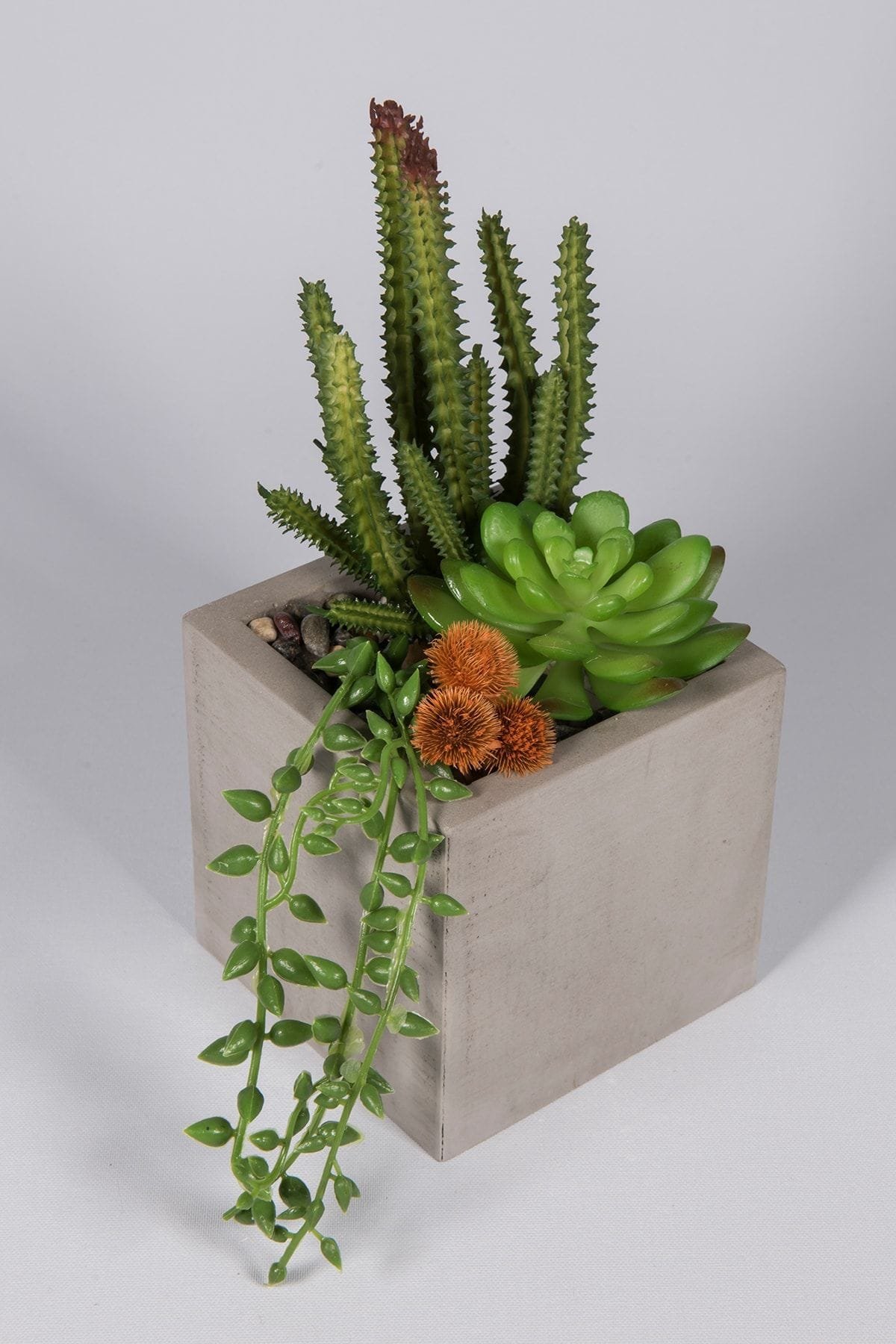 Gri beton saksıda yeşil yapay kaktüsler, canlı yeşil rengi sayesinde yapay görünümünden çıkıp oldukça canlı bir bitki izlenimi vermektedir. ; ürün, yaşam alanlarınızın dikkat çekici objelerinden biri olacaktır. ; Evinizde, ofisinizde, çalışma ve kişisel odalarınızda kısaca tüm yaşam alanlarınızda kullanabilirsiniz. ; Ürün toplam uzunluk:22 cm ; Ürün saksı uzunluğu:10 cm ;