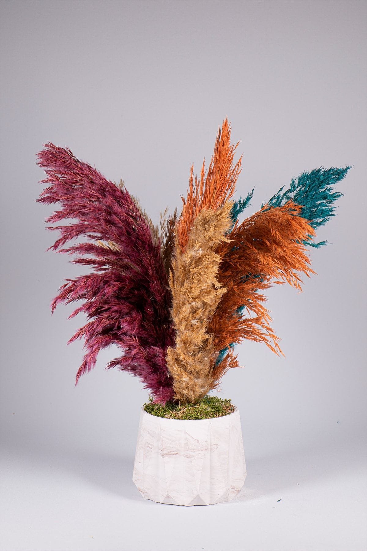 Handmade beton saksı içerisinde,sonbahar renklerinden esinlenerek tasarlanan pampaslar evinize ve iş yerinize eşsiz bir hava katacaktır. Pampas sayısı:6 Ürün saksı uzunluk:10 Ürün toplam uzunluk:40 cm