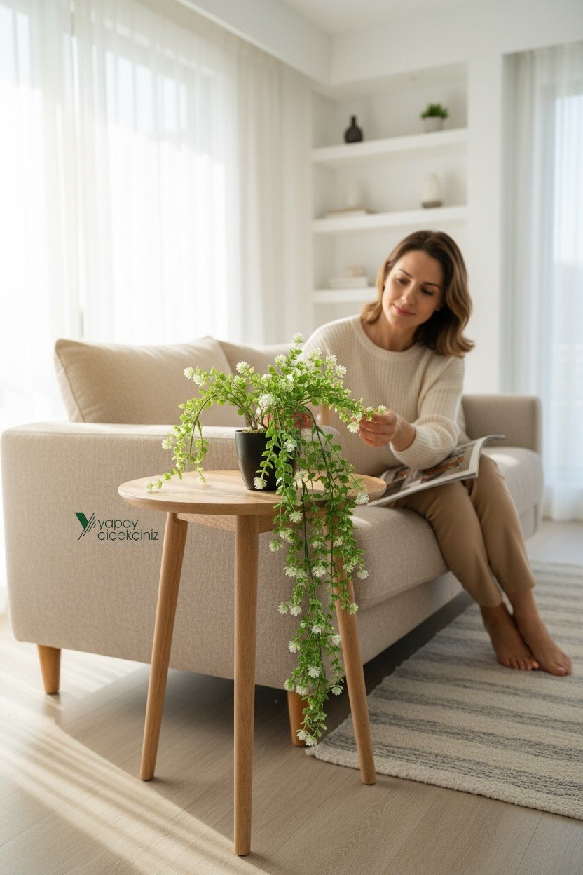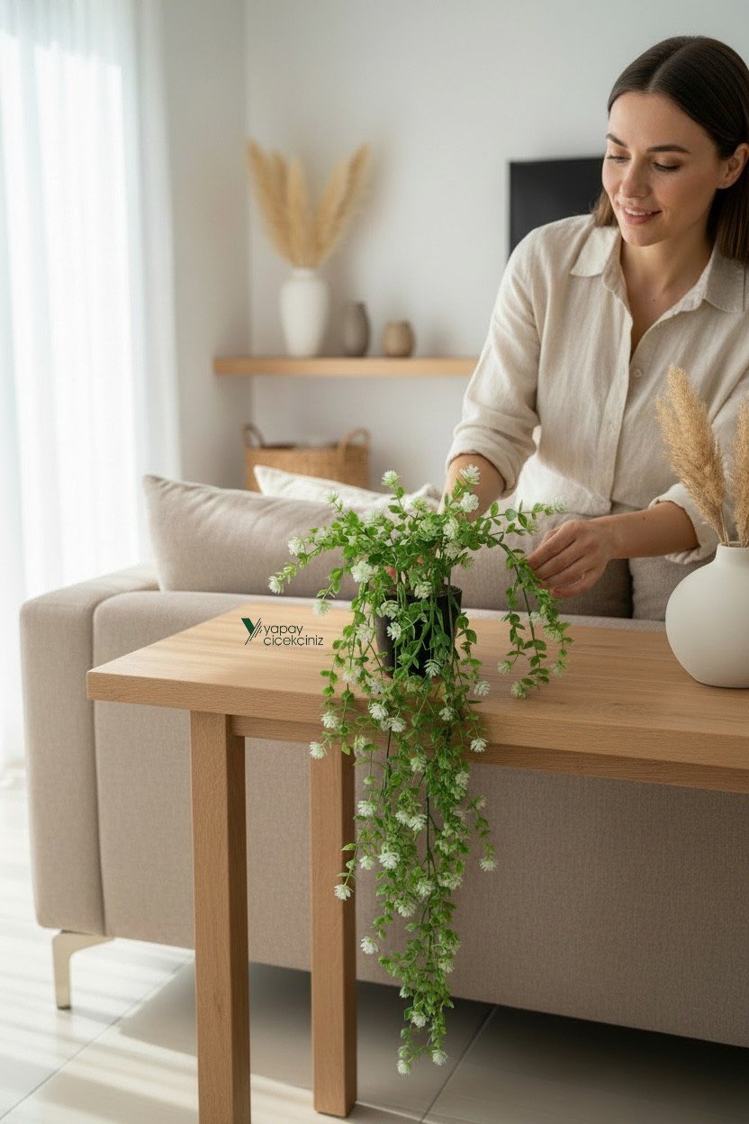 - Beyaz Plastik Saksıda Yoğun Yapraklı 90 Cm Yapay Sarkan Sarmaşık
