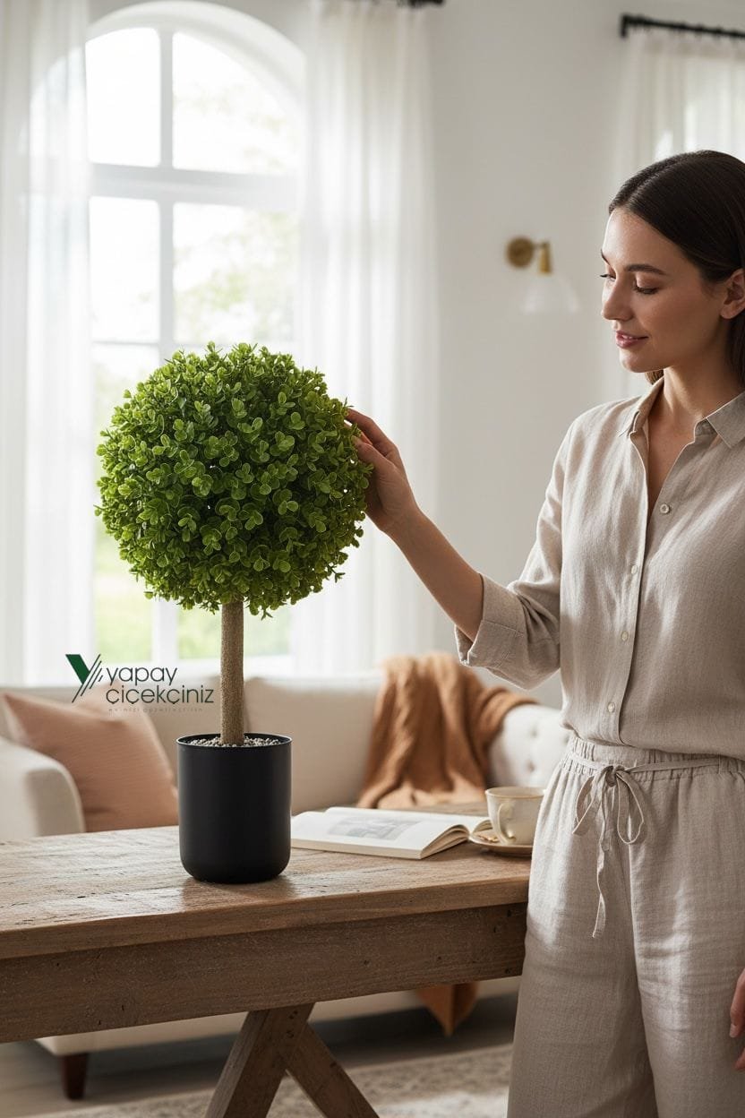 Ev ve ofis dekorasyonunda en çok tercih edilen modellerden biri olan 65 cm yapay top şimşir ağacı, modern siyah saksısıyla her ortama uyum sağlar. Yoğun yaprak yapısı ve 35×35 cm top formu ile doğal şimşir görünümünü birebir yansıtır.