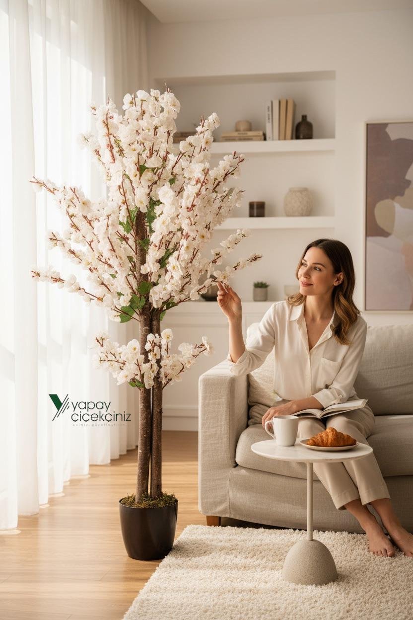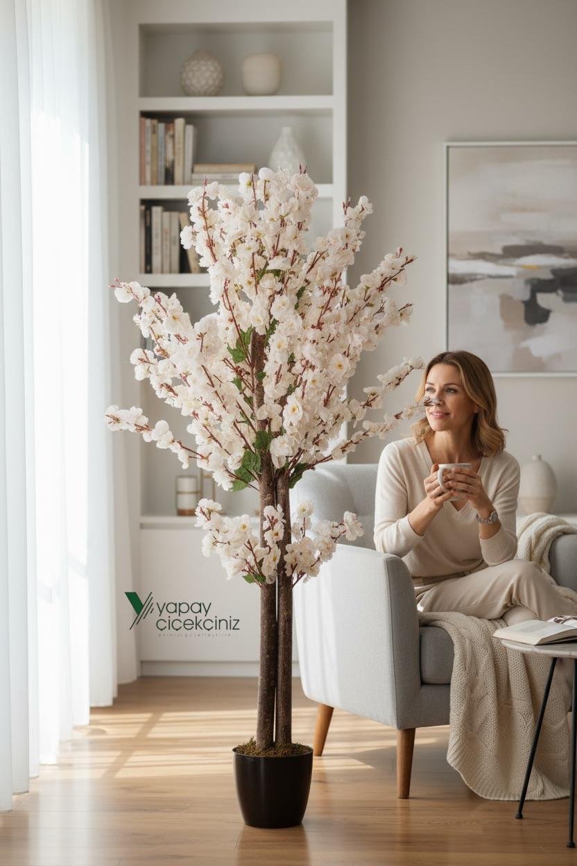 - Beyaz Saksıda 100 cm Yapay Lacivert Japon Bahardalı Ağacı